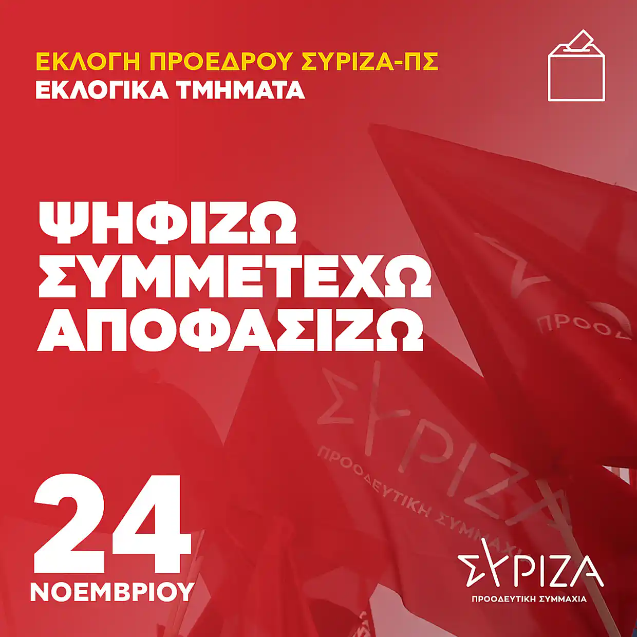 Έχουν οριστεί εκλογικά τμήματα σε όλη τη χώρα τα οποία μπορείτε να τα βρείτε https://syriza.gr/mathe-pou-psifizeis-gia-tis-ekloges-anadeixis-proedrou-tou-syriza-proodeftiki-symmachia-stis-24-noemvriou.