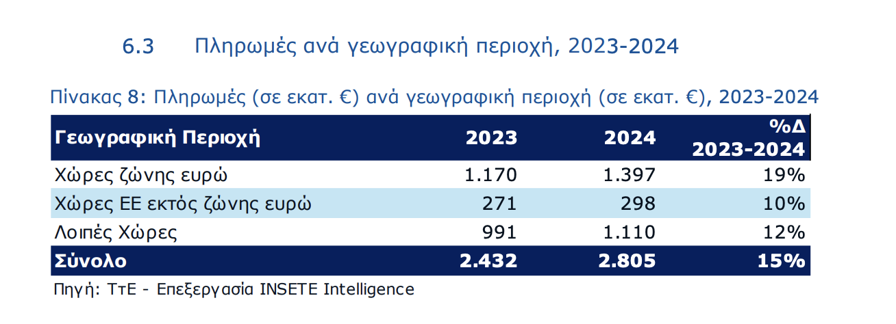 Τα ταξίδια προς χώρες της Ζώνης του Ευρώ, σε σύγκριση με αυτά προς τις υπόλοιπες χώρες, κατέγραψαν υψηλές θετικές ποσοστιαίες μεταβολές σε όλα τα μεγέθη (αναχωρήσεις +15%, διανυκτερεύσεις +5%, πληρωμές +19%) που είτε συμπαρέσυραν τα συνολικά μεγέθη σε αύξηση (αναχωρήσεις +8% και πληρωμές +15%) είτε σχεδόν κάλυψαν τις απώλειες (διανυκτερεύσεις -1%) των υπόλοιπων προορισμών.