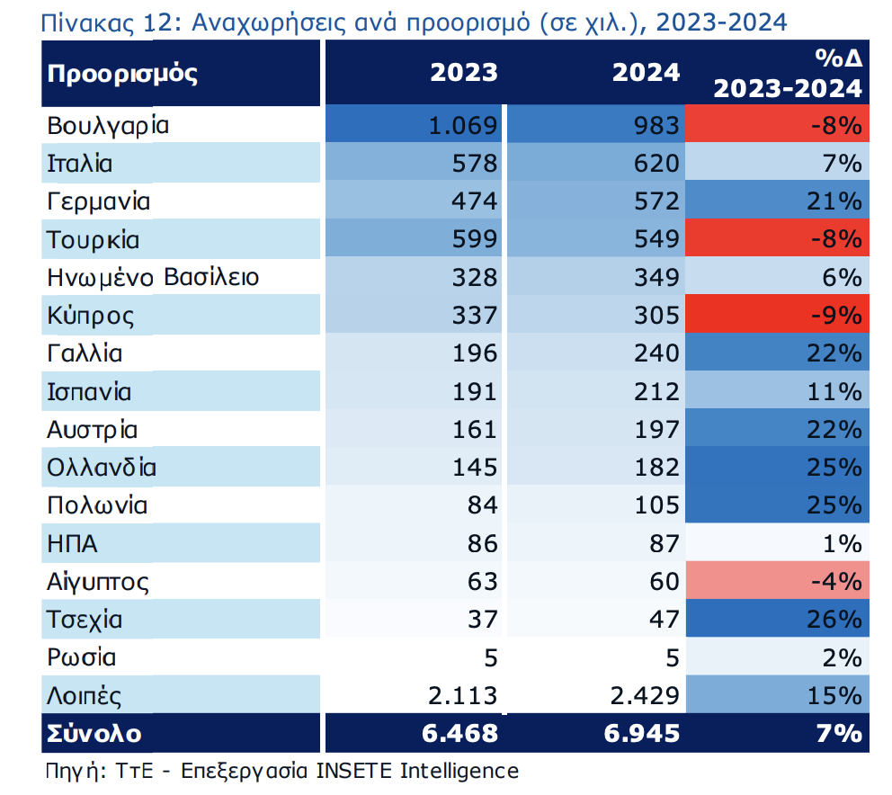Περαιτέρω με βάση τις αναχωρήσεις, το 2024 παρατηρείται μικρή αύξηση των μεριδίων των παραδοσιακών προορισμών υψηλής τουριστικής δαπάνης, όπως Γερμανία, Ηνωμένο Βασίλειο, Ιταλία, Γαλλία και Ολλανδία από 27% το 2023 σε 28% το 2024, και μείωση των όμορων προορισμών χαμηλής τουριστικής δαπάνης της Βουλγαρίας και της Τουρκίας από 26% το 2023 σε 22% το 2024.