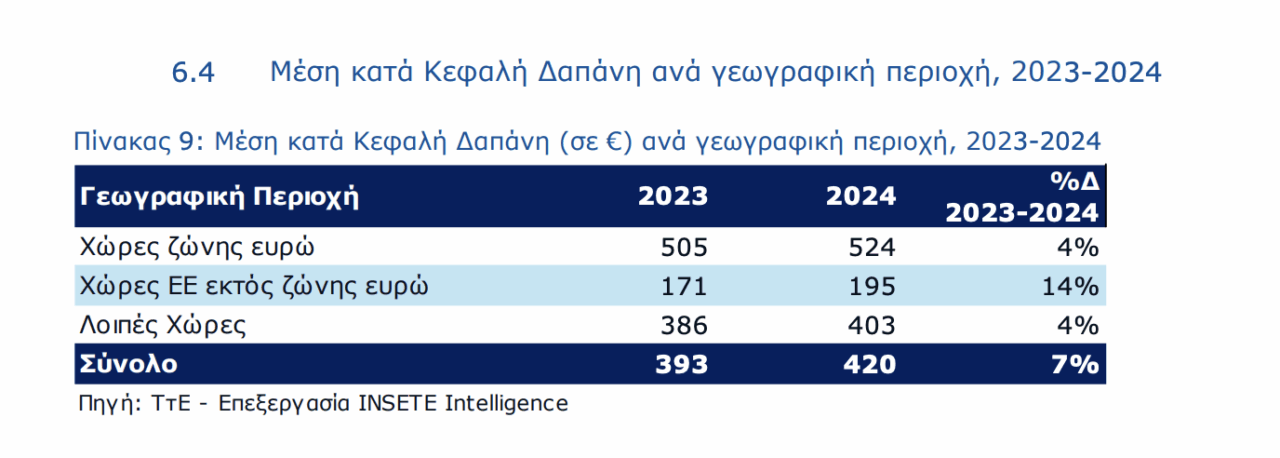 Είναι ενδεικτικό ότι με βάση τα επίσημα στοιχεία οι αναχωρήσεις από Ελλάδα αυξήθηκαν το 2024 κατά 8%, από 6,2 εκατ. το 2023 σε 6,7 εκατ. το 2024, ενώ οι δαπάνες είχαν διψήφιο ποσοστό αύξησης, στο +15%, από τα 2,4 δισ. του 2023 στα 2,8 δισ. ευρώ το 2024. Μάλιστα πρόκειται για το υψηλότερο νούμερο ιστορικά, δεδομένου ότι η σχετική Ερευνα Συνόρων της Τράπεζας της Ελλάδος καταγράφει τις τιμές από το 2005 κι αυτό, παρά την οριακή μείωση των διανυκτερεύσεων (-1%) στα 34,5 εκατ. το 2024. Η Μέση κατά Κεφαλή Δαπάνη (ΜΚΔ) ανήλθε στα 420 ευρώ το 2024, στο +7%, από τα 393 ευρώ του 2023 λόγω της αναλογικά υψηλότερης αύξησης που σημείωσε η Μέση Δαπάνη ανά Διανυκτέρευση (ΜΔΔ) κατά 17%, από τα 70 ευρώ το 2023 σε 81 ευρώ το 2024. Οι Ελληνες πάντως ξοδεύουν λιγότερα στο εξωτερικό σε σύγκριση με τα όσα ξοδεύουν οι ξένοι στην Ελλάδα σε ποσοστό, ενδεικτικά, 27% για τη Μέση κατά Κεφαλή Δαπάνη.