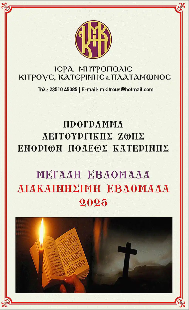 Πρόγραμμα Λειτουργικής Ζωής Ενοριών πόλεως Κατερίνης για την Μεγάλη Εβδομάδα και τη Διακαινήσιμη Εβδομάδα 2025