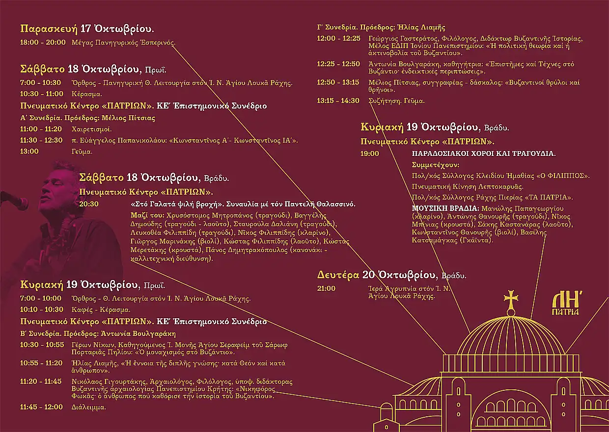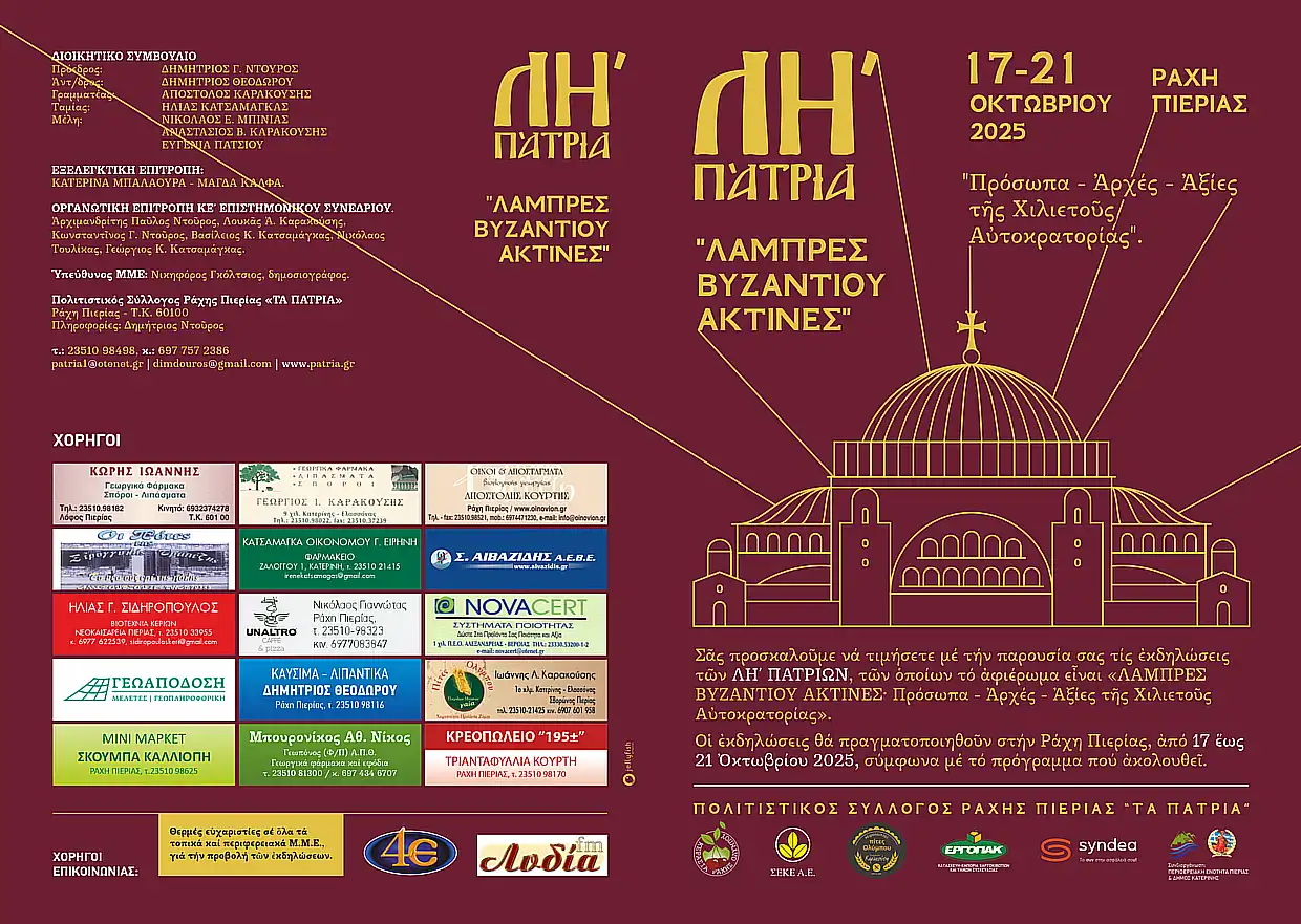 Οι εκδηλώσεις «ΛΗ’ ΠΑΤΡΙΑ», με θέμα «Πρόσωπα – Αρχές – Αξίες της Χιλιετούς Αυτοκρατορίας» και τίτλο «Λάμπρες Βυζαντίου Ακτίνες», θα πραγματοποιηθούν στη Ράχη Πιερίας από 17 έως 21 Οκτωβρίου 2025, με κεντρικό άξονα το Βυζάντιο.