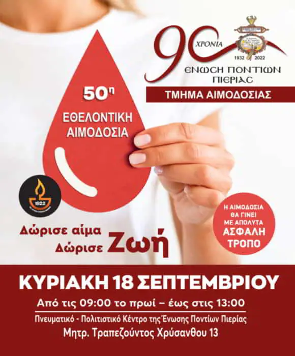 Το Διοικητικό Συμβούλιο της ΕΝΩΣΗΣ ΠΟΝΤΙΩΝ ΠΙΕΡΙΑΣ σας προσκαλεί στην 50η Εθελοντική Αιμοδοσία που θα πραγματοποιηθεί την Κυριακή 18 Σεπτεμβρίου 2022 από τις 9 το πρωί έως στις 1 το μεσημέρι, στο Πνευματικό-Πολιτιστικό κέντρο του Συλλόγου, Μητροπολίτου Τραπεζούντος Χρύσανθου 13.
