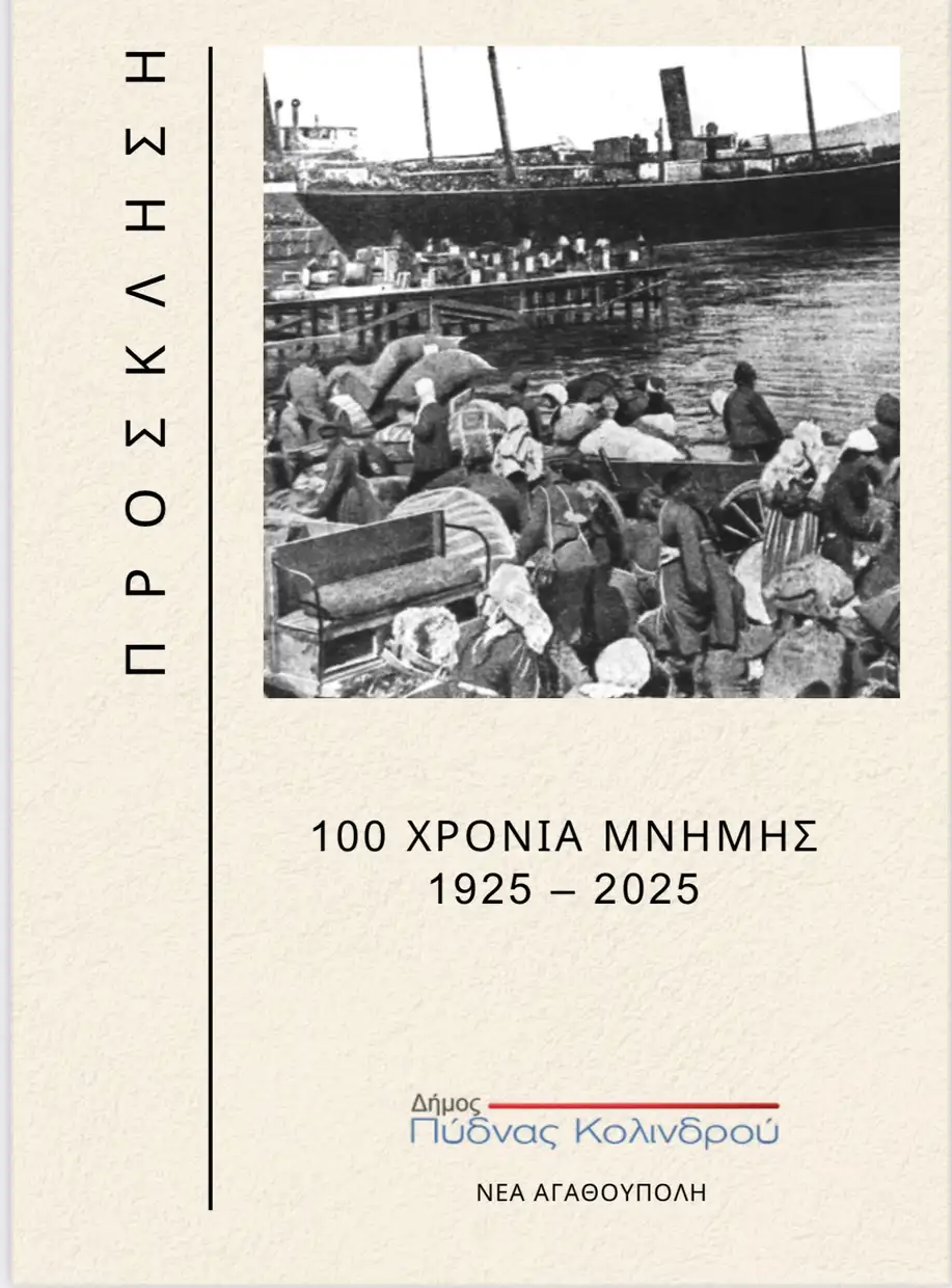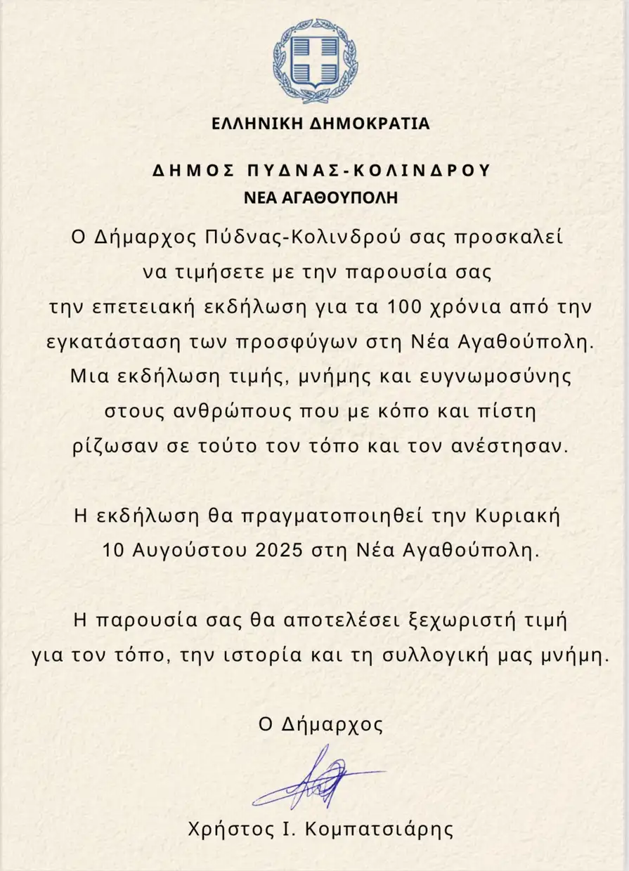 Ο Δήμαρχος Πύδνας – Κολινδρού σας προσκαλεί να τιμήσετε με την παρουσία σας την επετειακή εκδήλωση για τα 100 χρόνια από την εγκατάσταση των προσφύγων στη Νέα Αγαθούπολη, μια εκδήλωση τιμής, μνήμης και ευγνωμοσύνης στους ανθρώπους που με κόπο και πίστη ρίζωσαν σε τούτο τον τόπο.