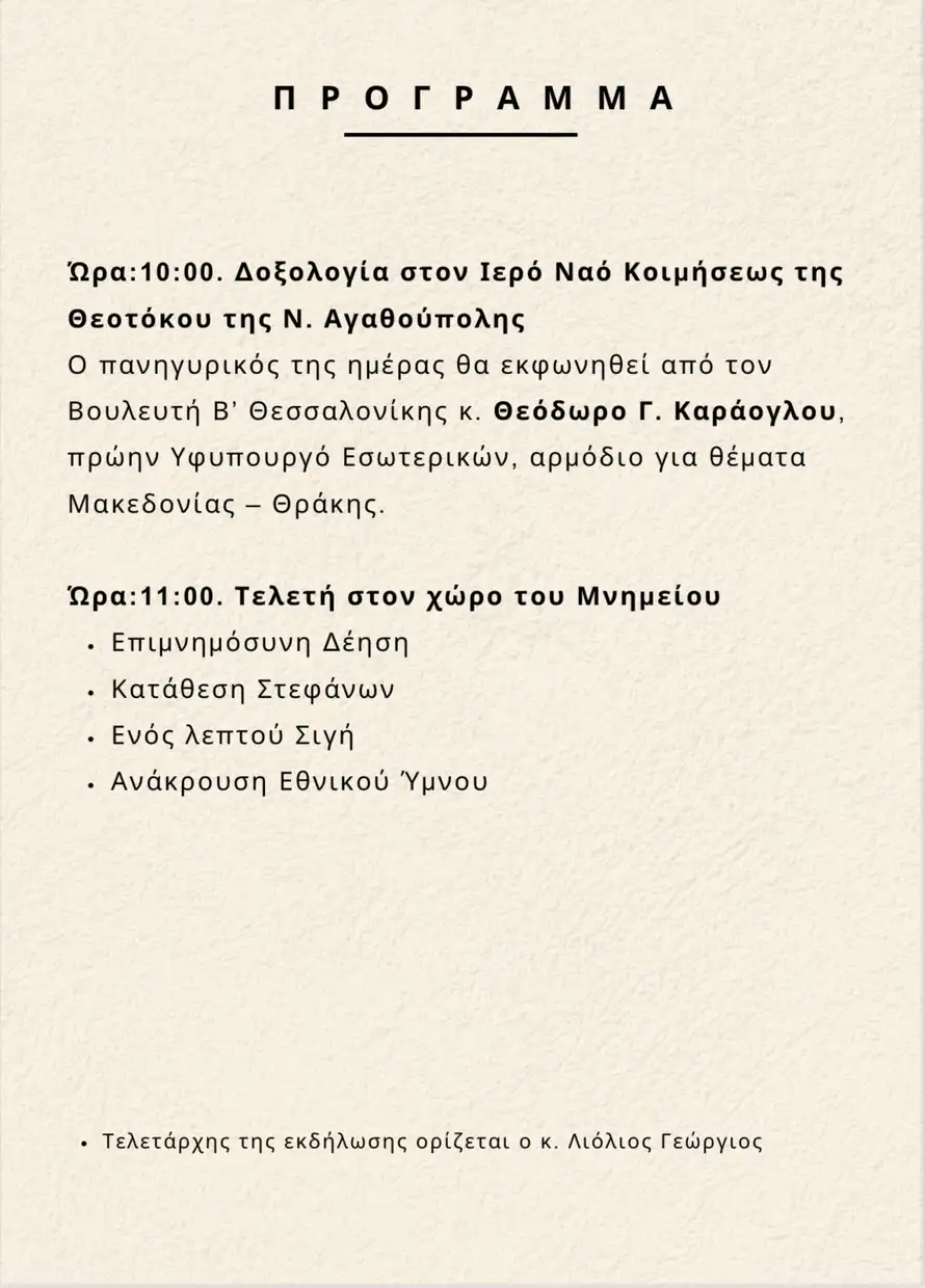 Η εκδήλωση θα πραγματοποιηθεί την Κυριακή 10 Αυγούστου 2025 στη Νέα Αγαθούπολη. Η παρουσία σας θα αποτελέσει ξεχωριστή τιμή για τον τόπο, την ιστορία και τη συλλογική μας μνήμη.