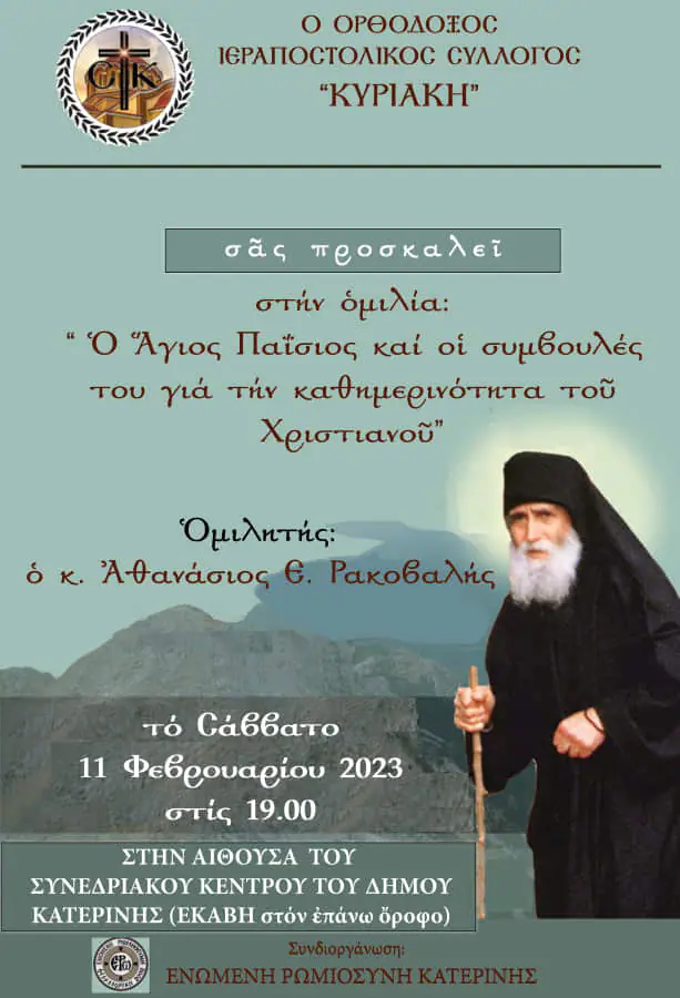 Ο ΟΡΘΟΔΟΞΟΣ ΙΕΡΑΠΟΣΤΟΛΙΚΟΣ ΣΥΛΛΟΓΟΣ “ΚΥΡΙΑΚΗ” σᾶς προσκαλεῖ στήν ὁμιλία: “ Ὁ Ἅγιος Παΐσιος καί οἱ συμβουλές του γιά τήν καθημερινότητα τοῦ Χριστιανοῦ”, τό Σάββατο 11 Φεβρουαρίου 2023, στίς 19.00.