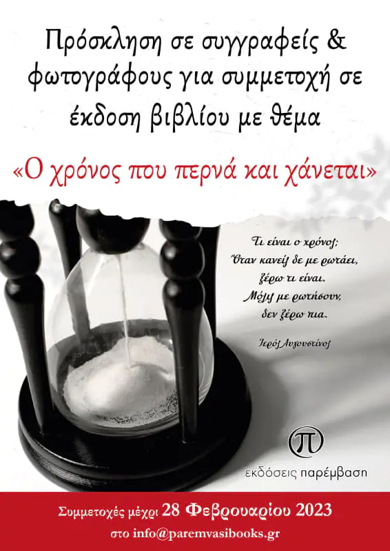 Οι Εκδόσεις Παρέμβαση, με αφορμή την άφιξη του Νέου Έτους, πρόκειται να πραγματοποιήσουν έκδοση βιβλίου με θέμα «Ο χρόνος που περνά και χάνεται». Θα είναι μία συλλογική έκδοση γύρω από το θέμα του χρόνου.