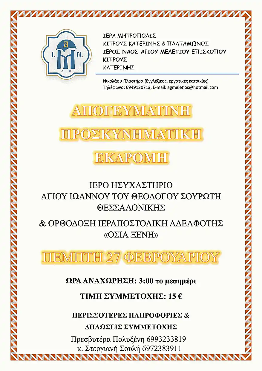 Προσκυνηματική εκδρομή από τον Ιερό Ναό Αγίου Μελετίου Κατερίνης