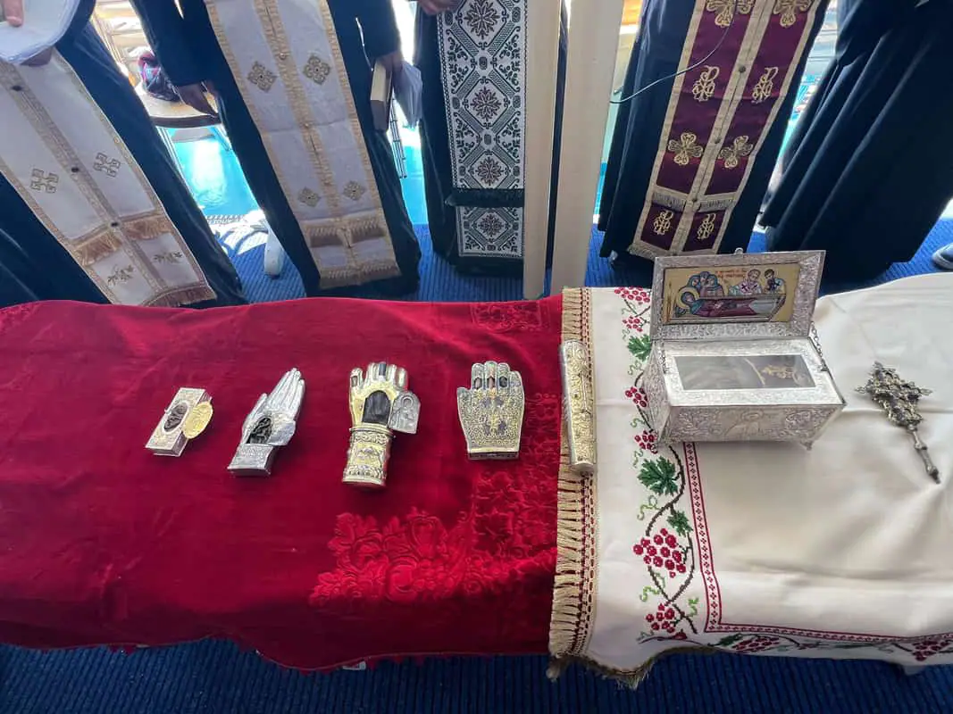Μπροστά στο θαλάσσιο χώρο της Ιεράς Μονής Γρηγορίου, πατέρες της Ιεράς Μονής μετέφεραν επί του πλοίου ι. Λείψανα προς ευλογία των πιστών.