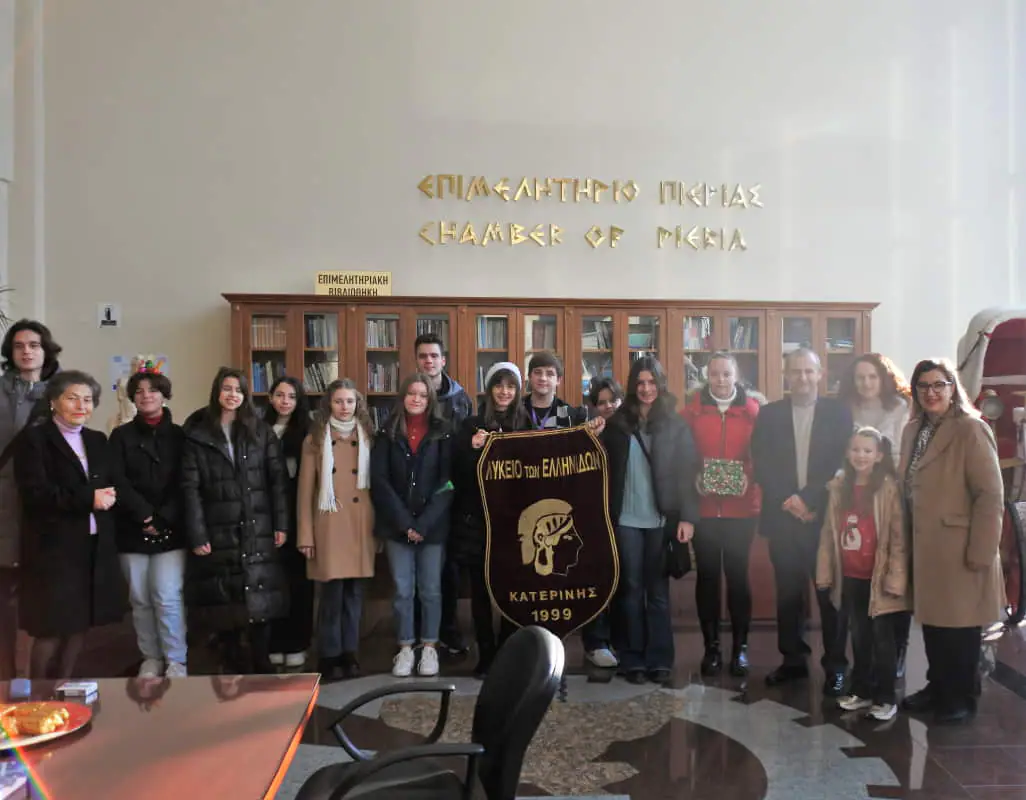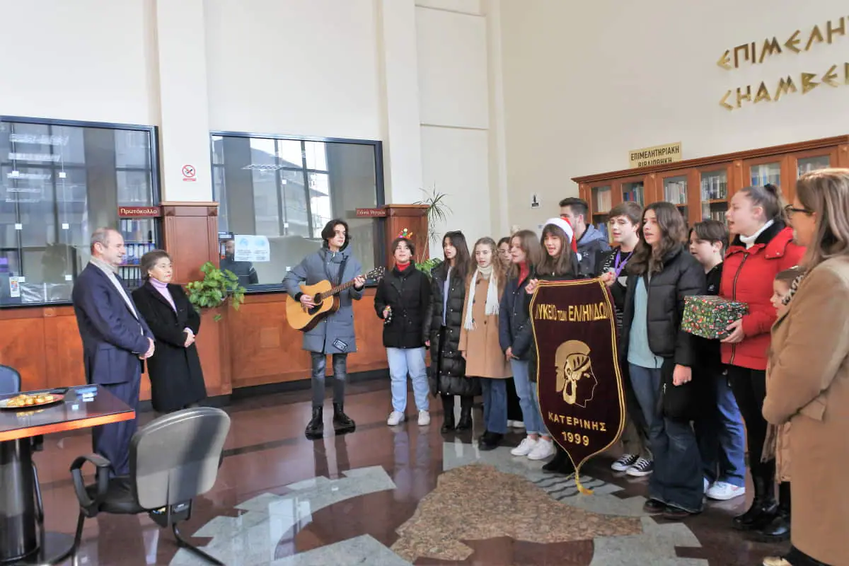Στη συνέχεια τα παιδιά του Λυκείου Ελληνίδων Κατερίνης, τραγουδήσανε με συνοδεία μουσικών οργάνων παραδοσιακά Πρωτοχρονιάτικα Κάλαντα.