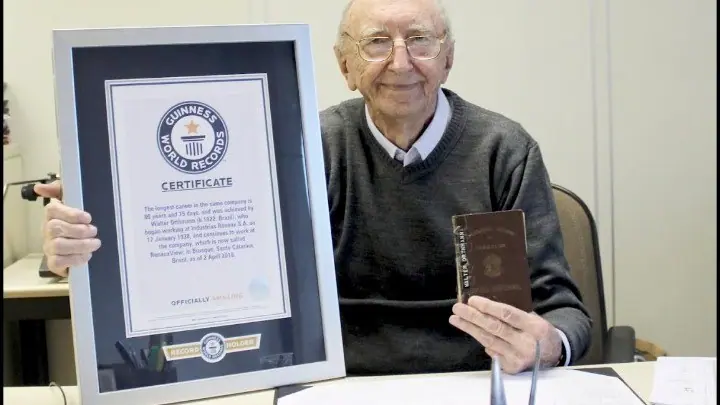 Ένας 100χρονος από την πόλη Μπρουσκ της νότιας Βραζιλίας κέρδισε μια θέση στο βιβλίο των Ρεκόρ Γκίνες για το μεγαλύτερο χρονικό διάστημα που έχει εργαστεί κανείς στην ίδια εταιρεία: ο Βάλτερ Όρτμαν συμπλήρωσε 84 συναπτά έτη!