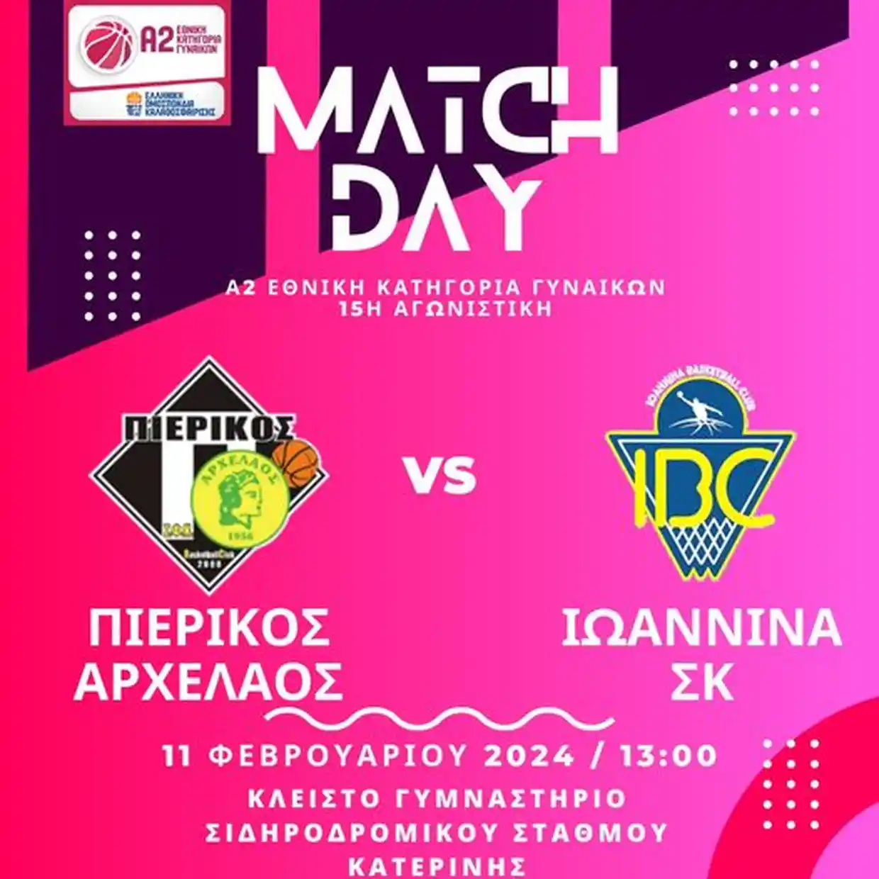 Τα Ιωάννινα ΣΚ (2-10) υποδέχεται ο Πιερικός Αρχέλαος (6-6) την Κυριακή 11 Φεβρουαρίου στις 13:00, στο Κλειστό Γυμναστήριο Σιδηροδρομικού Σταθμού Κατερίνης, στο πλαίσιο της 15ης αγωνιστικής του 2ου ομίλου της Α2 Εθνικής Κατηγορίας Γυναικών.