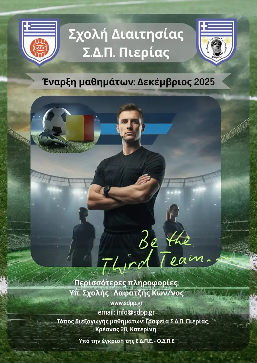 Ο Σύνδεσμος Διαιτητών Ποδοσφαίρου Πιερίας ανακοινώνει τη λειτουργία της νέας Σχολής Διαιτησίας 2025, η οποία θα ανοίξει τις πόρτες της στις 15 Δεκεμβρίου. Η δράση αυτή δίνει την ευκαιρία σε νέους και νέες που αγαπούν το ποδόσφαιρο να κάνουν το πρώτο τους βήμα στον χώρο της διαιτησίας, με συμμετοχή εντελώς δωρεάν.
