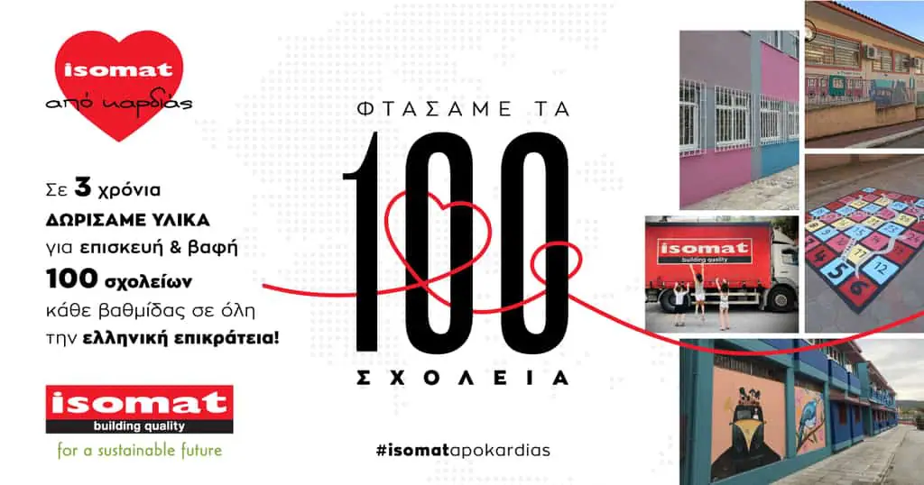 Η ISOMAT με μεγάλη χαρά κατάφερε τα 3 τελευταία χρόνια να δωρίσει υλικά της για επισκευή και βαφή 100 σχολείων κάθε βαθμίδας σε όλη την ελληνική επικράτεια, συμβάλλοντας έτσι στην αισθητική τους αναβάθμιση, με γνώμονα κυρίως τους μαθητές αλλά και το εκπαιδευτικό τους προσωπικό.