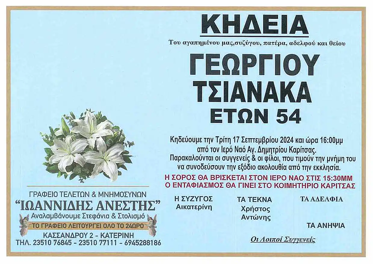 Έφυγε πολύ σύντομα από την ζωή ο Γεώργιος Τσιανάκας στα 54 έτη του, αφήνοντας πίσω την σύζυγο του και τα δυο της παιδιά.