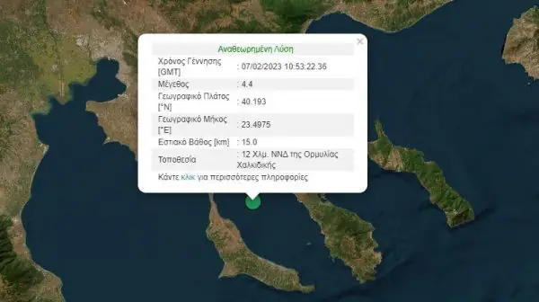 Ισχυρός σεισμός ταρακούνησε πριν λίγο (στις 12:53 το μεσημέρι της Τρίτης) τη Χαλκιδική. Σύμφωνα με την αναθεωρημένη λύση του Γεωδυναμικού Ινστιτούτου του Εθνικού Αστεροσκοπείου Αθηνών, σεισμός ήταν μεγέθους 4,4 βαθμών της κλίμακας Ρίχτερ.