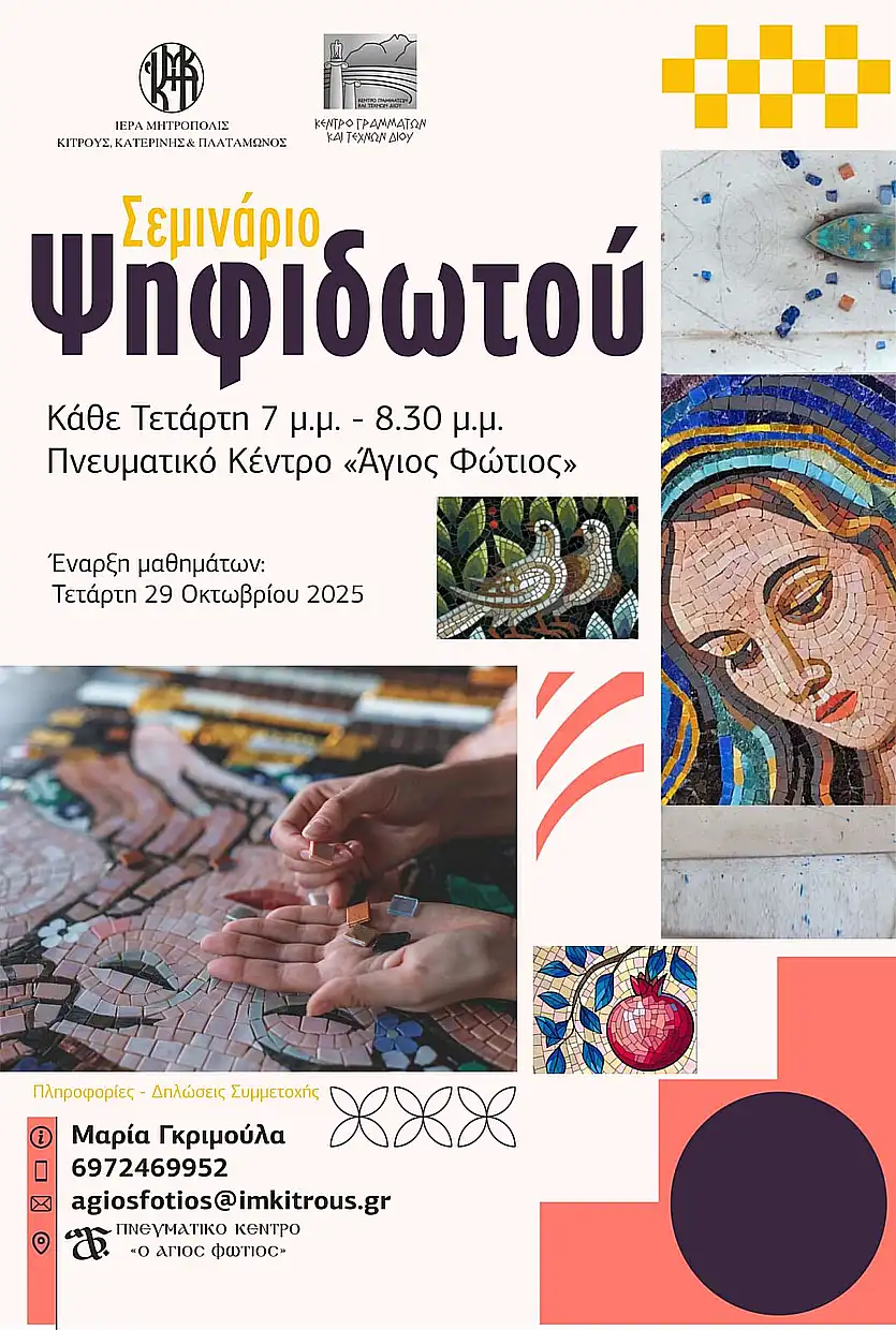 Στο πλαίσιο της πολιτιστικής εξωστρέφειας που προωθεί ο Σεβασμιώτατος Μητροπολίτης Kίτρους, Κατερίνης και Πλαταμώνος κ. Γεώργιος, το Πνευματικό Κέντρο της Ιεράς Μητροπόλεως «Άγιος Φώτιος» και το Κέντρο Γραμμάτων και Τεχνών Δίου διοργανώνουν Σεμινάριο Ψηφιδωτού.