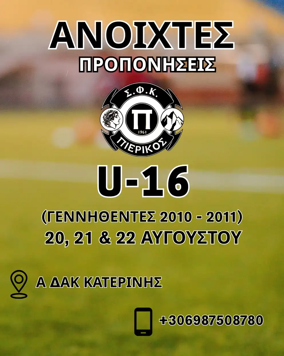 Όσοι ποδοσφαιριστές επιθυμούν να στελεχώσουν την υπάρχουσα ομάδα Κ-16 του ΣΦΚ ΠΙΕΡΙΚΟΥ 1961 (γεννηθέντες 2010 και 2011) η οποία έχει σκοπό να συμμετέχει σε αγώνες εντός και εκτός Πιερίας και να λάβουν μέρος στις ανοικτές προπονήσεις στις 20/21/22 Αυγούστου 2025 στο Προπονητικό Κέντρο του ΠΙΕΡΙΚΟΥ στο Α΄ ΔΑΚ Κατερίνης, να επικοινωνήσουν με τα παρακάτω τηλέφωνα.