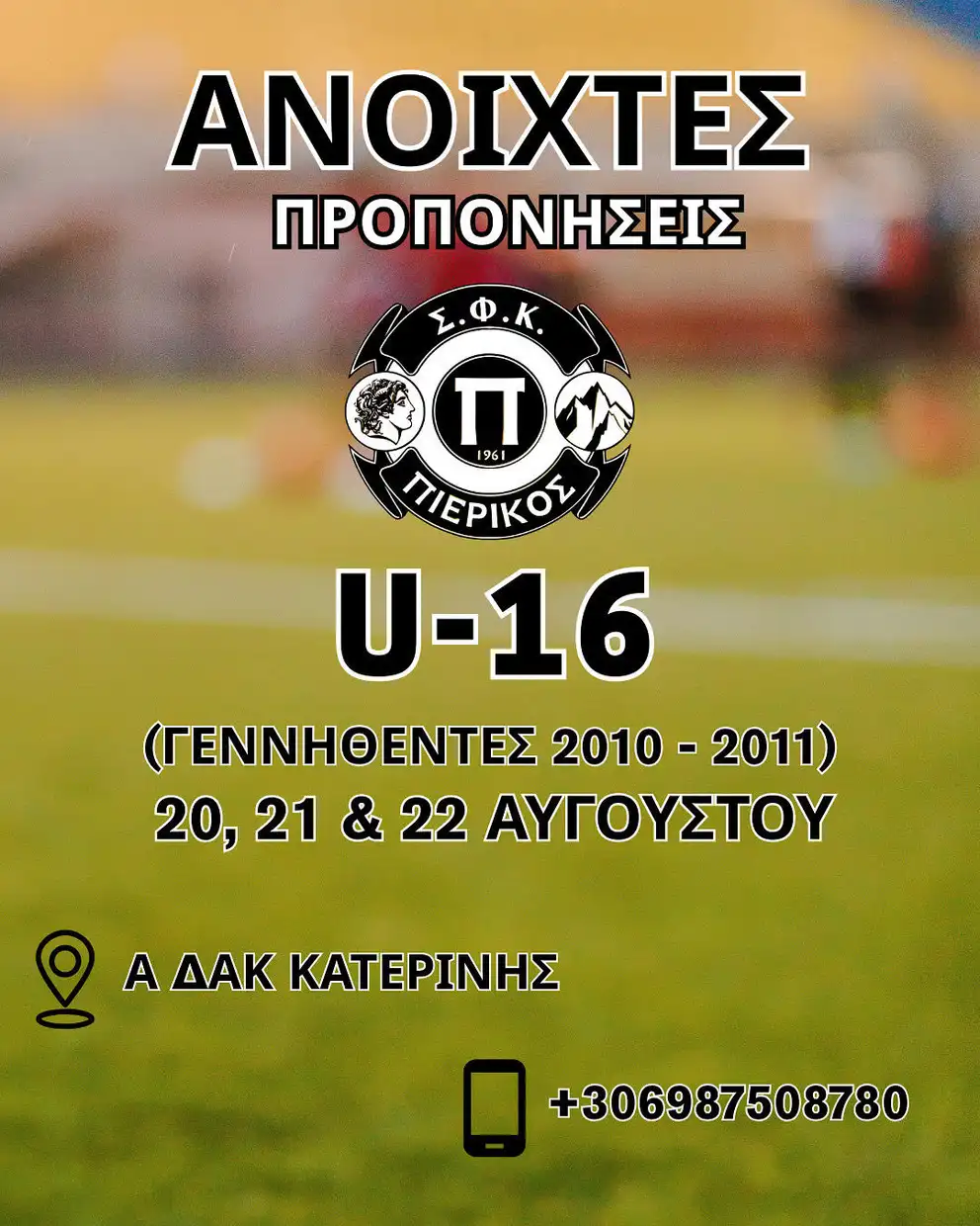 Όσοι ποδοσφαιριστές επιθυμούν να στελεχώσουν την υπάρχουσα ομάδα Κ-16 του ΣΦΚ ΠΙΕΡΙΚΟΥ 1961 (γεννηθέντες 2010 και 2011) η οποία έχει σκοπό να συμμετέχει σε αγώνες-πρωταθλήματα εντός και εκτός Πιερίας και να λάβουν μέρος στις ανοικτές προπονήσεις στις 20/21/22 Αυγούστου 2025 στο Προπονητικό Κέντρο του ΠΙΕΡΙΚΟΥ στο Α’ ΔΑΚ Κατερίνης, να επικοινωνήσουν με τα παρακάτω τηλέφωνα.