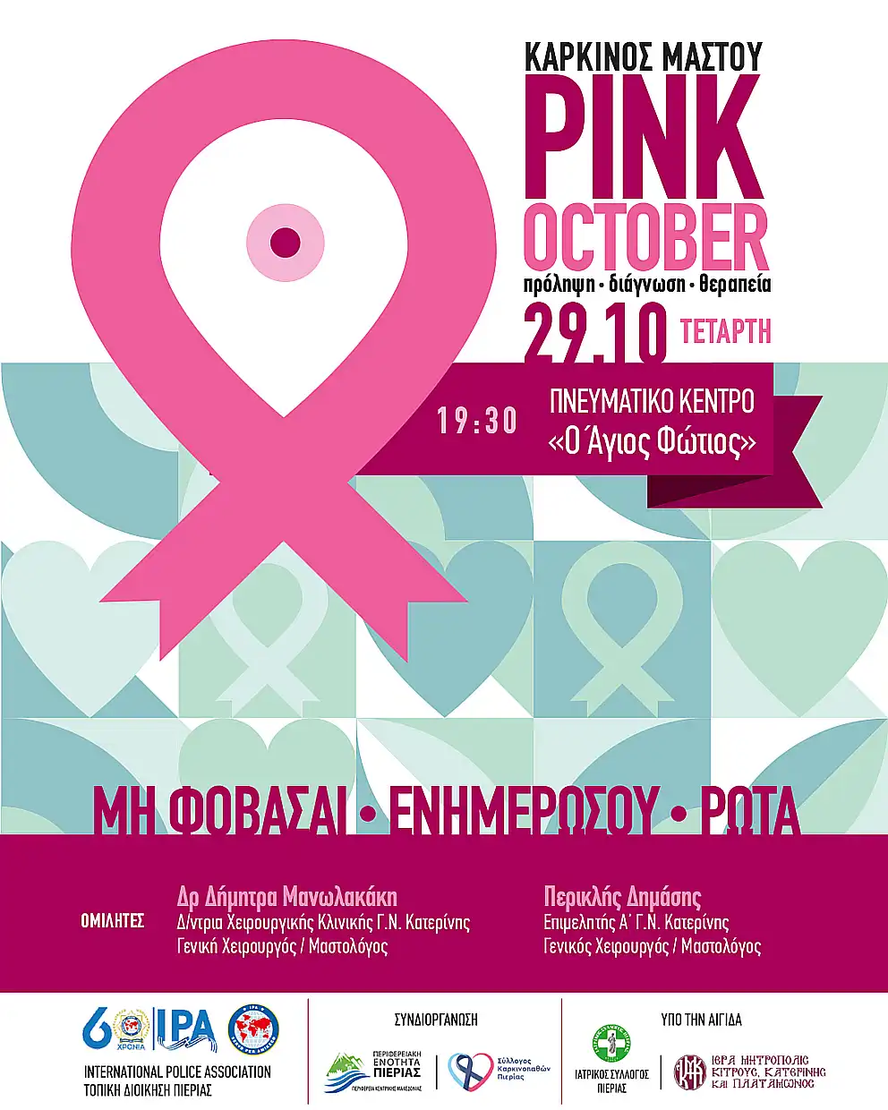 Η Περιφερειακή Ενότητα Πιερίας συνδιοργανώνει με την Τοπική Διοίκηση Πιερίας της International Police Association (IPA) και τον Σύλλογο Καρκινοπαθών Πιερίας, ενημερωτική εκδήλωση για τον καρκίνο του μαστού, την Τετάρτη 29 Οκτωβρίου στις 19:30, στο Πνευματικό Κέντρο «Άγιος Φώτιος».