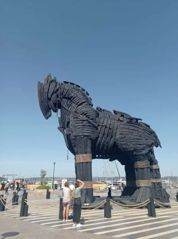 Στον αρχαιολογικό χώρο της Τροίας δεν θα μπορούσε να λείπει και ένα ομοίωμα Δούρειου ίππου, ένα ξύλινο άλογο σε μεγάλες διαστάσεις που άλλοτε ήταν επισκέψιμο και στους εσωτερικούς του χώρους αλλά πλέον, έχει απαγορευτεί η πρόσβαση. Ένα μεγαλύτερο ξύλινο άλογο, «διαφημίζει» την Τροία και στο Τσανάκκαλε, την επαρχιακή μεγαλούπολη στη νότια ακτή των Δαρδανελίων, που απέχει περίπου 20 χιλιόμετρα από την αρχαία Τροία. Το άλογο- απομίμηση του Δούρειου ίππου, χρησιμοποιήθηκε στην αμερικάνικη ταινία «Τροία», που σκηνοθέτησε το 2004 ο Βολφγκανγκ Πέτερσεν, με πρωταγωνιστή τον Μπραντ Πιτ στον ρόλο του Αχιλλέα.