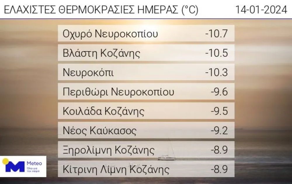 Σύμφωνα με το δίκτυο αυτόματων μετεωρολογικών σταθμών του Εθνικού Αστεροσκοπείου Αθηνών – meteo.gr οι οκτώ χαμηλότερες ελάχιστες θερμοκρασίες τις πρωινές ώρες της Κυριακής 14/01, παρουσιάζονται στον παρακάτω πίνακα.
