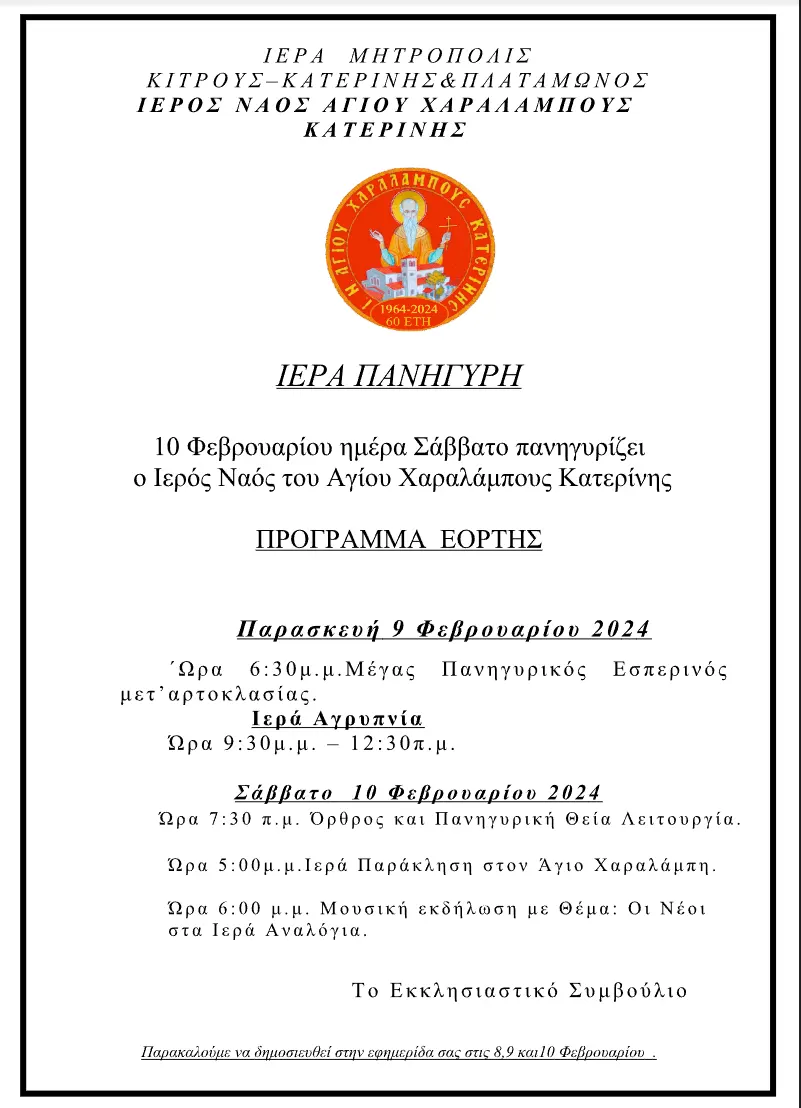 Στις 10 Φεβρουαρίου ημέρα Σάββατο πανηγυρίζει ο Ιερός Ναός του Αγίου Χαραλάμπους Κατερίνης