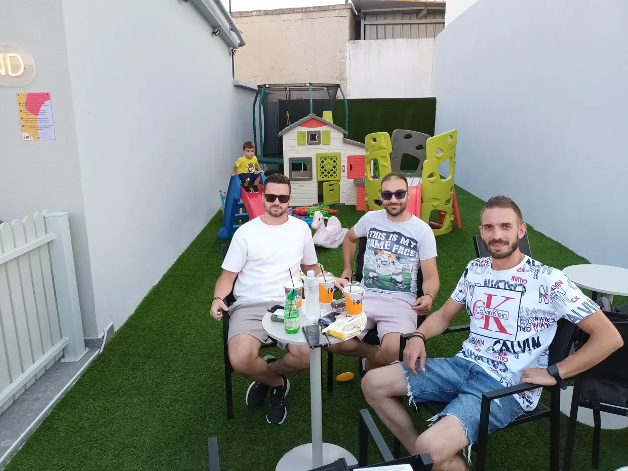 Στο “coffee island” του παλιού ποδοσφαιριστή του Αιγινιακού Στέφανου Μαγούδη (πλησίον της  τράπεζας Πειραιώς), στο Αιγίνιο απολάμβαναν τον καφέ τους εντός του παιδότοπου τρείς παλαίμαχοι … ποδοσφαιριστές, νεαρής ηλικίας της Αιγινιώτικης ομάδας, που τη βοήθησαν σημαντικά στα “πέτρινα χρόνια” της Β’ ερασιτεχνικής κατηγορίας της ΕΠΣ Πιερίας του πρόσφατου παρελθόντος.