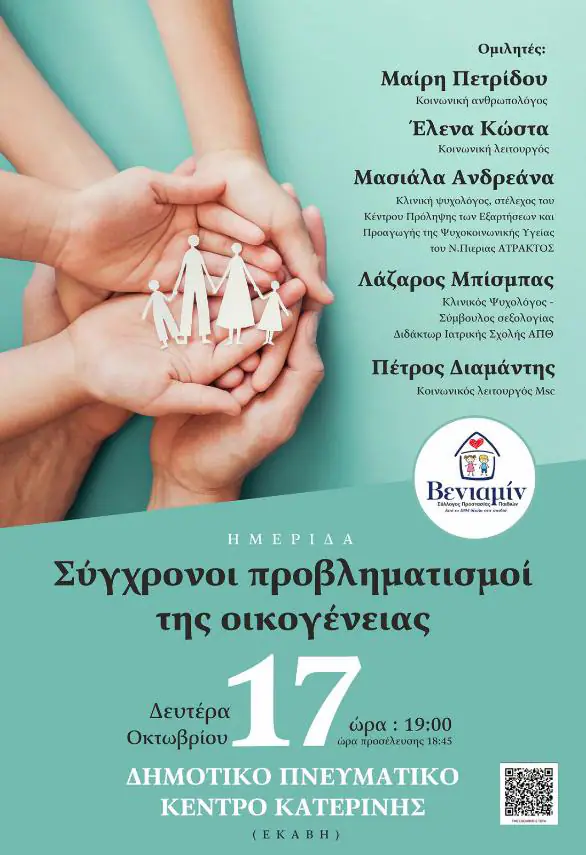 Ο Σύλλογος Προστασίας Παιδιών ΒΕΝΙΑΜΙΝ σας προσκαλεί την ερχόμενη Δευτέρα 17/10 και ώρα 19:00 στο Δημοτικό Πνευματικό Κέντρο Κατερίνης “ΕΚΑΒΗ” (1ο Όροφο) στην ημερίδα που διοργανώνει με τίτλο « Σύγχρονοι προβληματισμοί της οικογένειας»