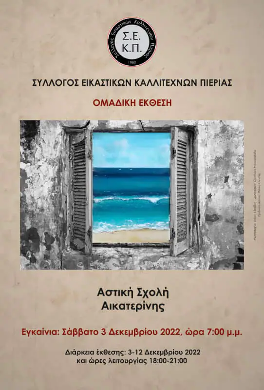 Τα εγκαίνια της πρώτης ομαδικής έκθεσης των μελών του, θα γίνουν το Σάββατο 3 Δεκεμβρίου 2022, στην Αστική Σχολή της Αικατερίνης, (πρώην 1ο Δημοτικό σχολείο) στην οδό Ειρήνης, ώρα 7:00 μ.μ. Στα εγκαίνια θα τιμηθούν για την πολυετή προσφορά τους στην Τέχνη και τον Πολιτισμό, οι ζωγράφοι Γιάννης Γκόγκος, Αθανάσιος Καραμήτας και Αθανάσιος Σταθακόπουλος, οι οποίοι υπήρξαν ιδρυτικά μέλη του συλλόγου.