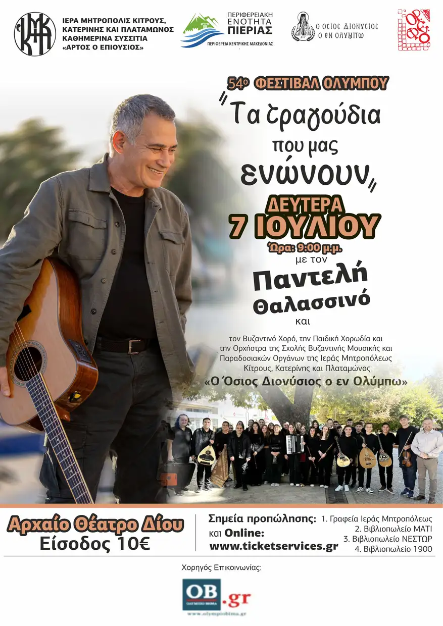 Σε μια σπουδαία μουσική παράσταση ο καταξιωμένος καλλιτέχνης, ο Βυζαντινός Χορός, η Παιδική Χορωδία και η Ορχήστρα της Σχολής Βυζαντινής Μουσικής και Παραδοσιακών Οργάνων «Ο Όσιος Διονύσιος ο εν Ολύμπω» της Ιεράς μας Μητροπόλεως ερμηνεύουν έργα Ελλήνων συνθετών.