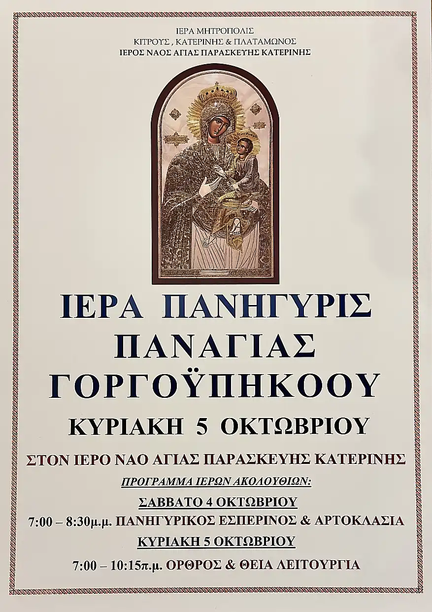 Ολύμπιο Βήμα » Επικαιρότητα » Κοινωνικά » Σύναξη της Παναγίας Γοργοϋπηκόου: Η Μεγάλη Πανήγυρις στην Αγία Παρασκευή Κατερίνης