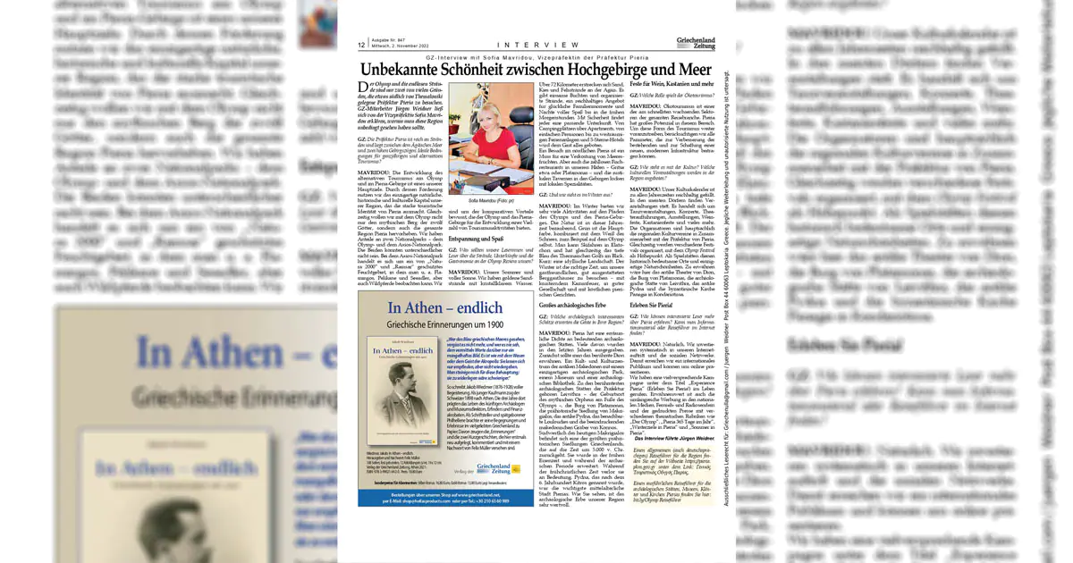 Αυτή τη φορά στην γερμανική εφημερίδα «Griechenland Zeitung» φιλοξενείται συνέντευξη της Αντιπεριφερειάρχη Πιερίας κα Σοφίας Μαυρίδου στον δημοσιογράφο κ. Jürgen Weidner .