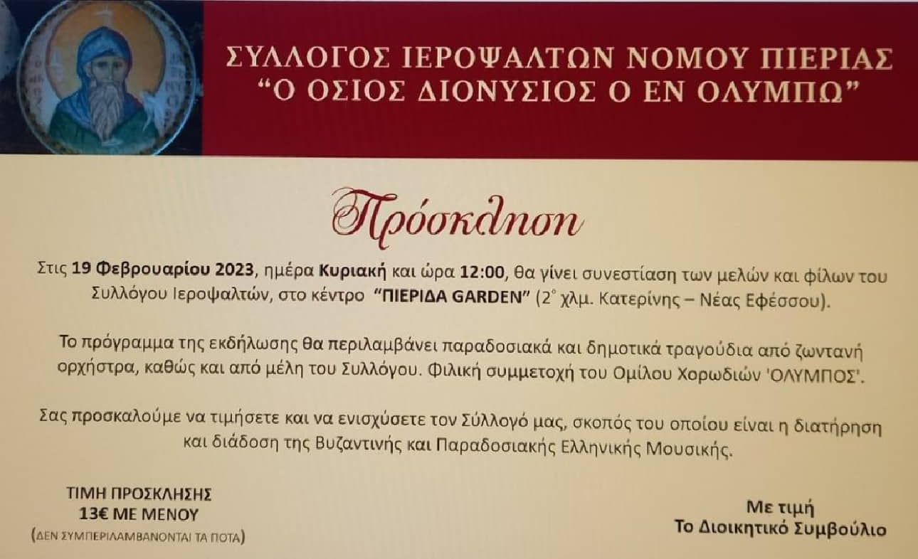Ύστερα από μια “παύση” τριών χρόνων, ο Σύλλογος Ιεροψαλτών Ν. Πιερίας βρίσκεται στην ευχάριστη θέση να οργανώσει ξανά ετήσια συνεστίαση.