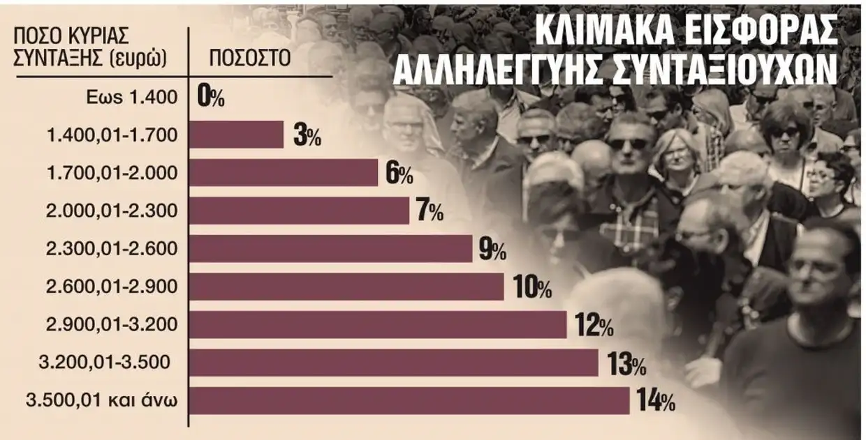 Βελτιωτικές αλλαγές στην ισχύουσα κλίμακα της Εισφοράς Αλληλεγγύης Συνταξιούχων (ΕΑΣ), η οποία «ροκανίζει» μέχρι το 1/3 της αύξησης στις συντάξεις. Πρόκειται για την ειδική εισφορά αλληλεγγύης συνταξιούχων, η οποία επιβλήθηκε με το πρώτο Μνημόνιο για τα ποσά κύριας σύνταξης άνω των 1.400 ευρώ (16.800 ετήσιο εισόδημα), με σκοπό την κάλυψη ελλειμμάτων του συστήματος από τον λογαριασμό του ΑΚΑΓΕ (Ασφαλιστικό Κεφάλαιο Αλληλεγγύης Γενεών). Η ΕΑΣ (εισφορά υπέρ ΑΚΑΓΕ) επιβάλλεται σχεδόν σε 800.000 συνταξιούχους Δημοσίου, ΙΚΑ, Ταμείων ΔΕΚΟ και τραπεζών, ΕΤΑΑ και ΝΑΤ, με κύρια σύνταξη ή άθροισμα κύριων συντάξεων άνω των 1.400 ευρώ. Η κυβέρνηση έχει ήδη καταργήσει από 1/1/2023 μια άλλη εισφορά αλληλεγγύης, η οποία επιβαλλόταν στη φορολογία σε όσους μισθωτούς, δημοσίους υπαλλήλους, ελεύθερους επαγγελματίες και συνταξιούχους έχουν εισοδήματα άνω των 12.000 ευρώ.