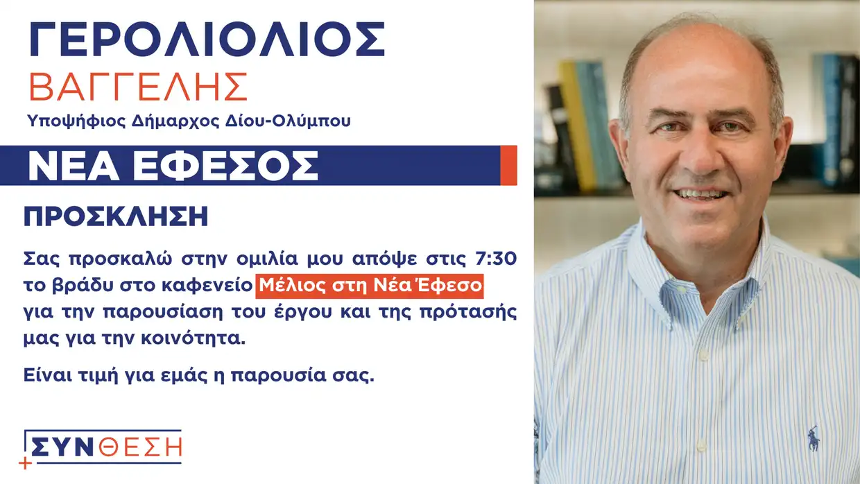 Ο υποψήφιος δήμαρχος Δίου-Ολύμπου, Βαγγέλης Γερολιόλιος, σας προσκαλεί στην παρουσίαση του έργου, της πρότασης και των προγραμματικών θέσεων του συνδυασμού ΣΥΝΘΕΣΗ, για την κοινότητα της Νέας Εφέσου, απόψε στις 7:30 το βράδυ στο καφενείο “Μέλιος”