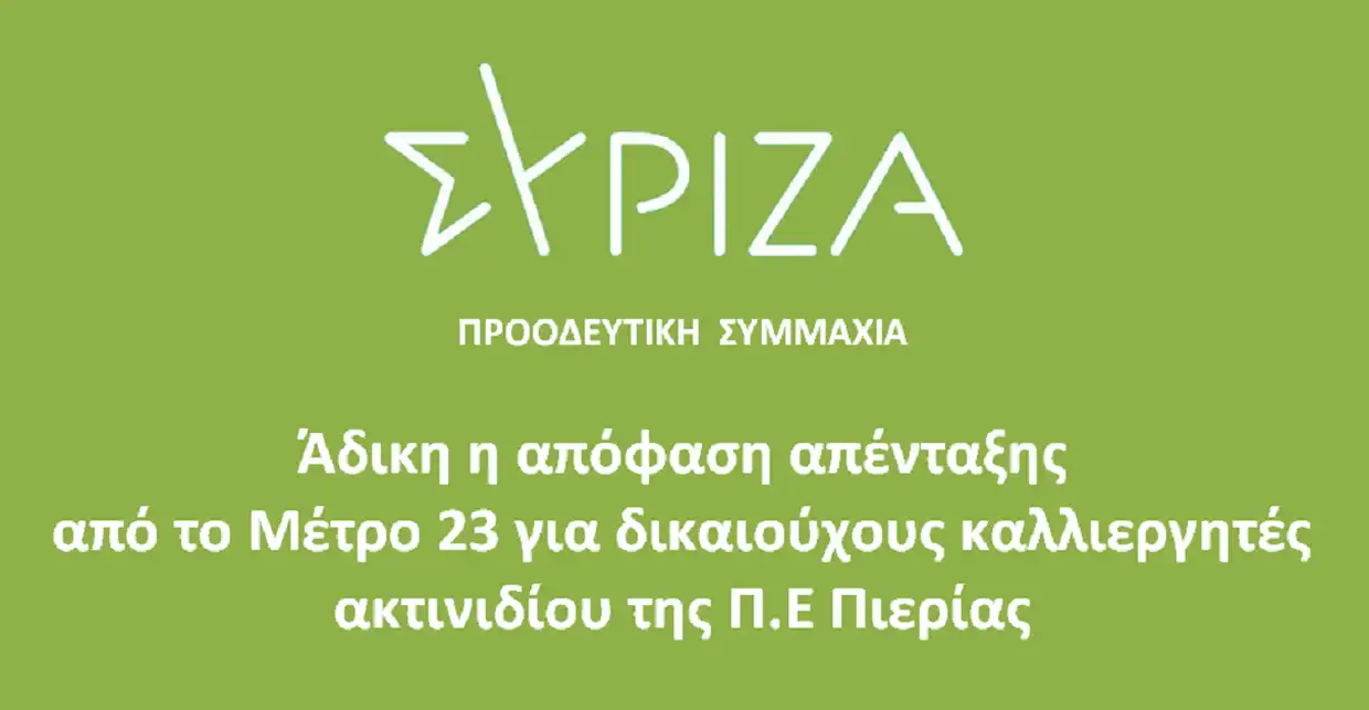 Η Νομαρχιακή Επιτροπή ΣΥΡΙΖΑ Πιερίας, εκφράζει την έντονη ανησυχία και διαμαρτυρία της, για την άνευ προηγουμένου αδικία που υφίστανται δεκάδες καλλιεργητές ακτινιδίου της Π.Ε. Πιερίας, οι οποίοι αποκλείστηκαν αναίτια από το Μέτρο 23 «Έκτακτη προσωρινή στήριξη ρευστότητας στους γεωργούς που έχουν πληγεί από φυσικές καταστροφές».