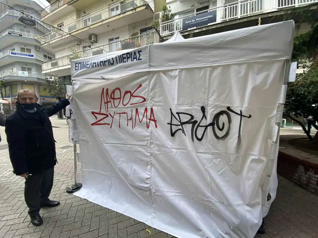 Αλγεινή εντύπωση προκάλεσε η γραφή με σπρέι στο περίπτερο του Επιμελητηρίου Πιερίας, που στήθηκε στον πεζόδρομο της Κατερίνης για την πρωτοβουλία προώθησης της τοπικής αγοράς.