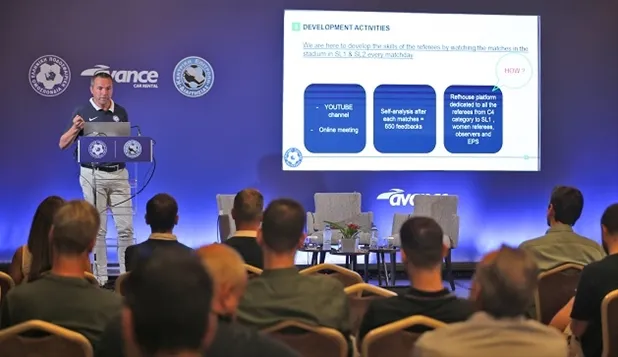 Ο κ. Πάολο Βαλέρι ανέλυσε στατιστικά στοιχεία για τις παρεμβάσεις του VAR στους αγώνες της σεζόν 2024-25 και στάθηκε στη σημασία του ρόλου των VAR specialists κκ Κουμπαράκη και Πουλικίδη.