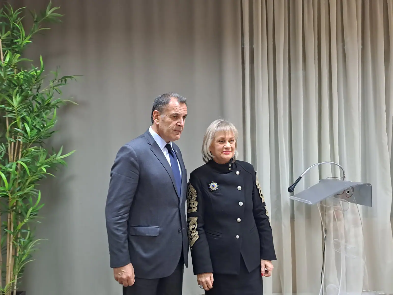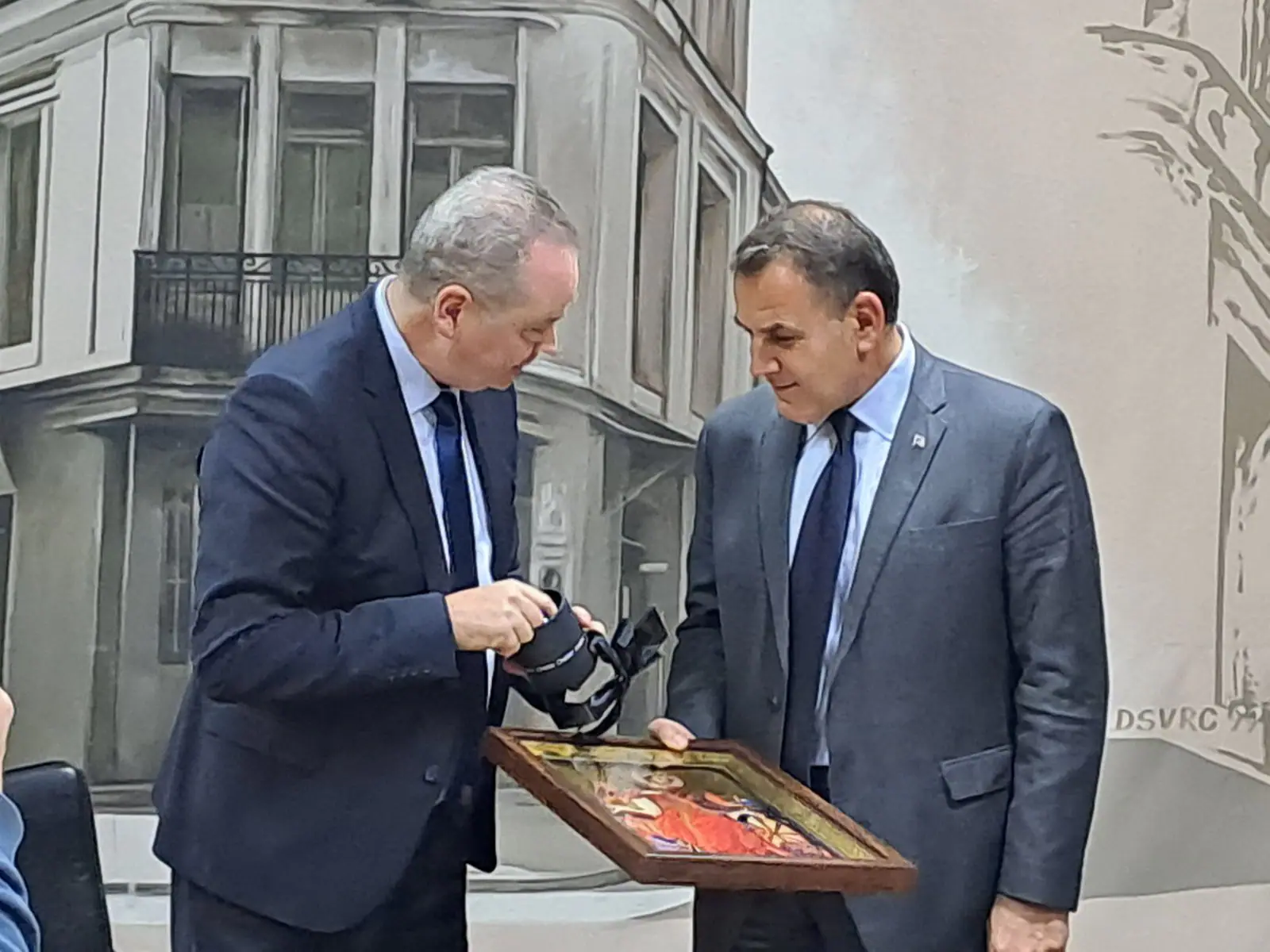 Στο τέλος της εκδήλωσης Ο Δήμαρχος Κατερίνης Κωνσταντίνος Κουκοδήμος και ο πρόεδρος των «Ολύμπιον εν Διώ» Θανάσης Ι. Μπίντας, πρόσφεραν στον Υπουργό Εθνικής Άμυνας την εικόνα της Πολιούχου μας Αγίας Αικατερίνης και άλλα δώρα εκφράζοντας την αμέριστη τιμή για την παρουσία του.