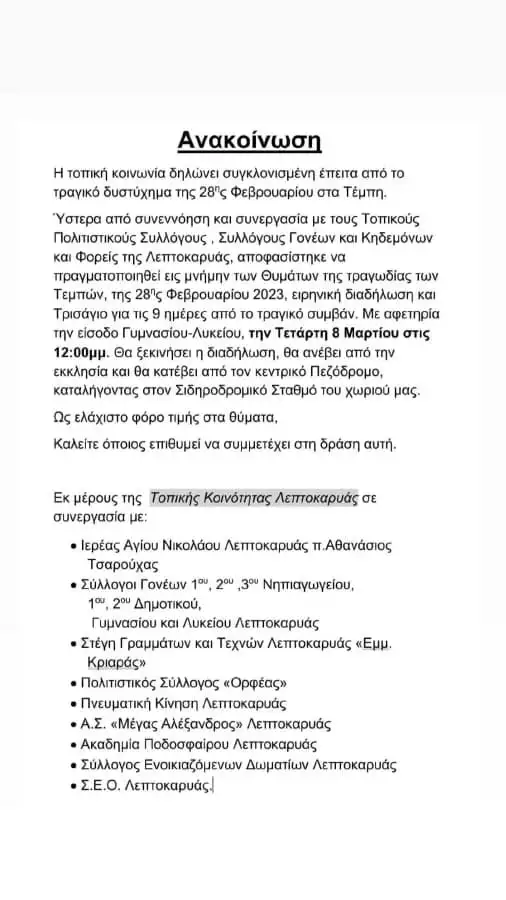 Αύριο Τετάρτη 08/03 θα πραγματοποιηθεί πορεία και τρισάγιο, στη Λεπτοκαρυά Πιερίας στις 12 το μεσημέρι για τον άδικο χαμό των συνανθρώπων μας.