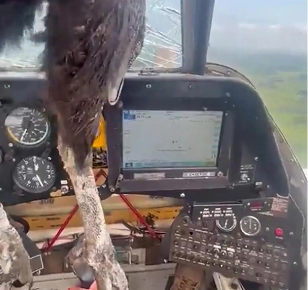 Το περιστατικό που συνέβη στο Vinces, στην επαρχία Los Rios, καταγράφηκε σε βίντεο. Δείχνει ένα τεράστιο πτηνό να βρίσκεται σφηνωμένο στο πιλοτήριο και νεκρό, αφού συγκρούστηκε με το παρμπρίζ του αεροσκάφους.