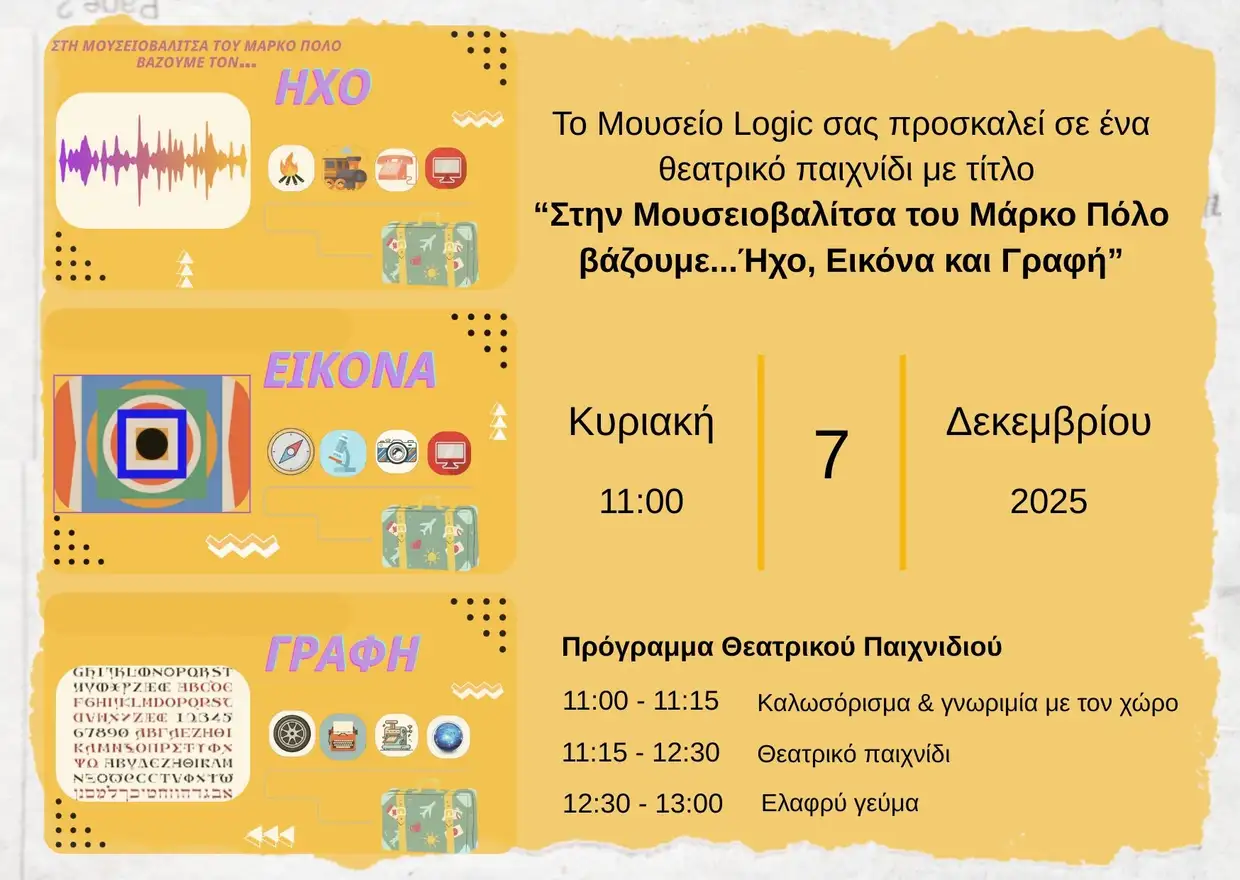 Το Θέατρο Μώ, το Μουσείο Logic και η Inclusive Lines ενώνουν τις δυνάμεις τους για μια δράση που τιμά την προσβασιμότητα, τη δημιουργικότητα και τον πολιτισμό της Κατερίνης. Την Κυριακή 7 Δεκεμβρίου, στις 11:00 το πρωί, νέοι 15 έως 18 ετών –τυφλοί και βλέποντες– θα συναντηθούν στο Μουσείο Logic για ένα θεατρικό παιχνίδι που φέρνει στο προσκήνιο τον κόσμο του Μάρκο Πόλο και των μεγάλων εφευρετών μέσα από ήχο, αφή και γραφή.