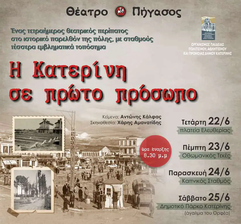 Τέταρτος σταθμός (Σάββατο 25 Ιουνίου, ώρα 8.30 μ.μ) Δημοτικό Πάρκο Κατερίνης (άγαλμα του Ορφέα), με την Έλλη (Άννα Γκούντα), που έφτασε εδώ με τα καραβάνια των ξεσπιτωμένων προσφύγων της Μικράς Ασίας, της Ανατολικής Ρωμυλίας και του Πόντου, κουβαλώντας τον πόνο του ξεριζωμού και τη νοσταλγία του γενέθλιου τόπου της, θέλοντας να χτίσει νέο σπιτικό στο χώρο όπου το Κοινοτικό Συμβούλιο Κατερίνης είχε προγραμματίσει να γίνει το Δημοτικό Πάρκο Κατερίνης.