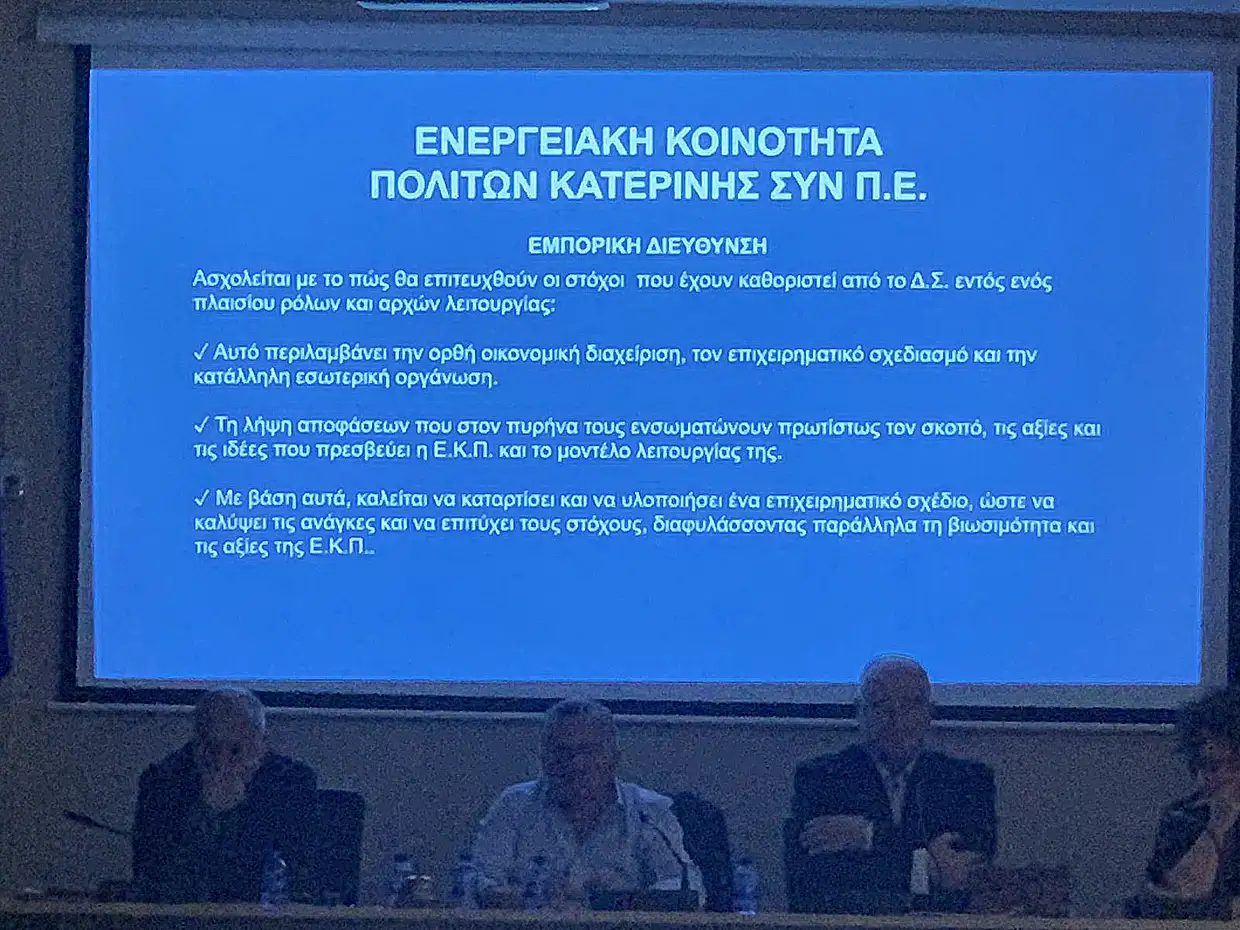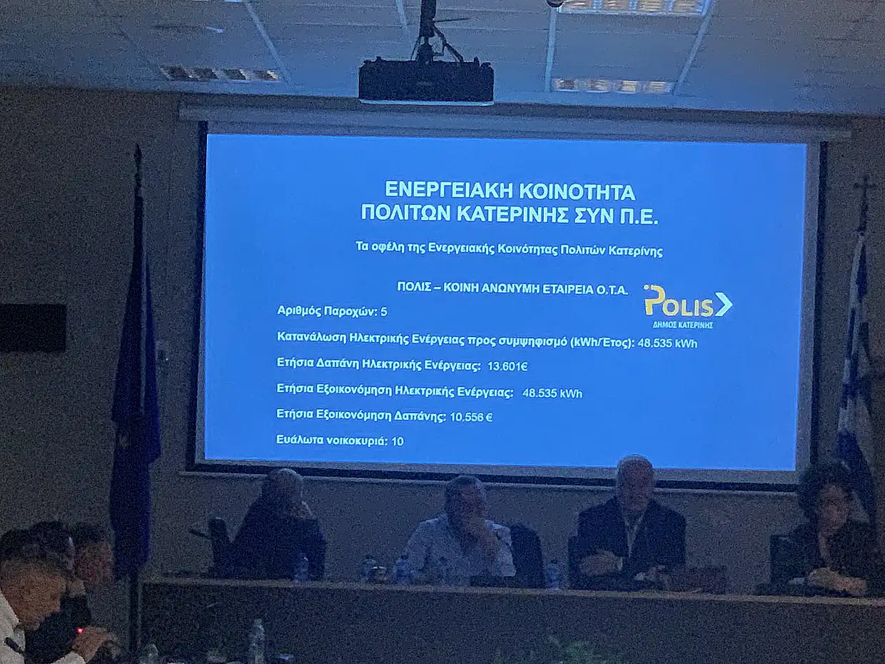 Στα θέματα της ημερήσιας διάταξης, παρουσιάστηκε και επίσημα η σύσταση ενεργειακής κοινότητας από τον δημοτικό σύμβουλο Σάββα Οφείδη. Παρουσίασε το έργο με το οποίο ο Δήμος θα μειώσει τις λειτουργικές δαπάνες κατά έξι εκατομμύρια τον χρόνο, και έτσι θα πάνε χρήματα και σε έργα ενεργειακής αναβάθμισης, αλλαγές καυστήρων σε σχολεία, οδοφωτισμό κλπ., αλλά και σε κοινωφελή έργα όπως το δωρεάν ρεύμα σε άπορες οικογένειες, τονίζοντας ότι μέχρι το τέλος της θητείας πάνω από 800 άπορες οικογένειες θα έχουν δωρεάν ενέργεια. Πρόκειται για έργο που όχι μόνο αφορά και τις επόμενες δεκαετίες αλλά και εξασφαλίζει συνθήκες βιωσιμότητας.