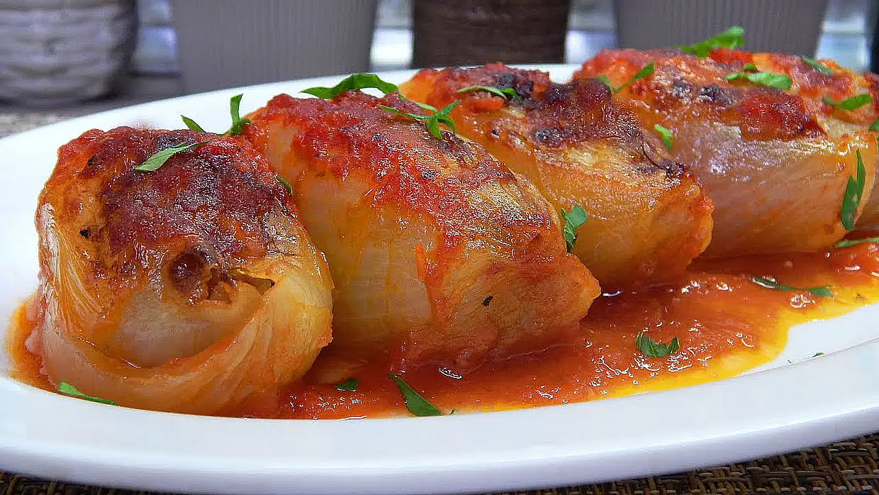Οι κρεμμυδοντολμάδες γίνονται και νηστίσιμο πιάτο, αν αφαιρέσουμε τον κιμά.