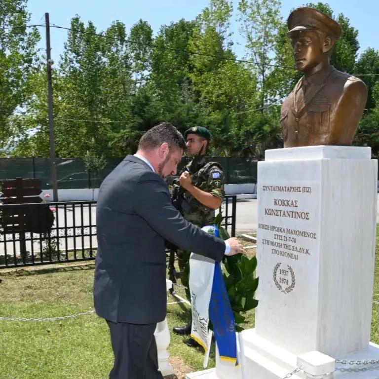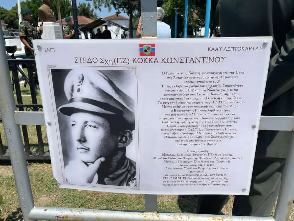 Ο Συνταγματάρχης Κωνσταντίνος Κόκκας, ως επικεφαλής Διμοιρίας του 6ου Λόχου της Ελληνικής Δύναμης Κύπρου, έπεσε υπέρ πίστεως και πατρίδος στις πολεμικές επιχειρήσεις του 1974, στην περιοχή του χωριού «ΚΙΟΝΕΛΙ», στην Κύπρο, υπερασπιζόμενος την κυριαρχία της μεγαλονήσου κατά την τουρκική εισβολή.