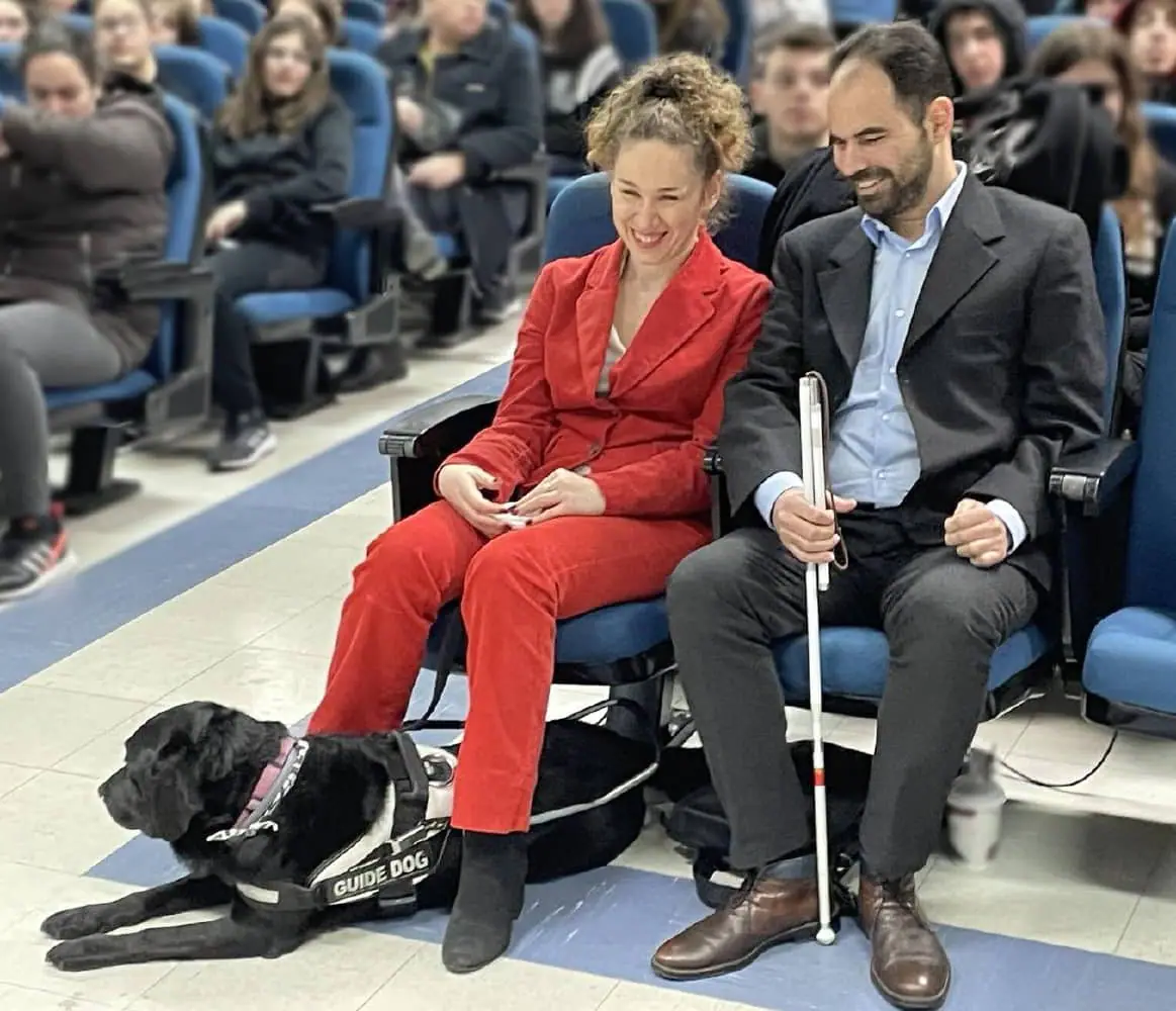 Παράλληλα, ο Βαγγέλης Αυγουλάς, τυφλός δικηγόρος, μέλος του ΔΣ του Δικηγορικού Συλλόγου Αθηνών και η φιλόλογος, χειρίστρια σκύλου οδηγού και motivational speaker της ΑΜΚΕ «Με Άλλα Μάτια», Τζουλιάνα Μπούσι, μέσα από ελεύθερο διάλογο έλυσαν απορίες που διατυπώθηκαν και βοήθησαν τη σχολική κοινότητα της Κατερίνης, να πλησιάσει περισσότερο τις έννοιες της Συμπερίληψης και της Προσβασιμότητας.