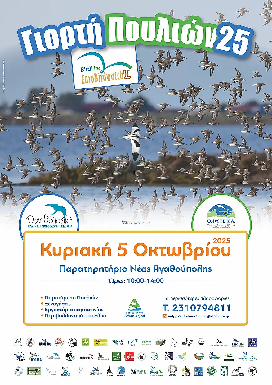 Μια ξεχωριστή ανοιχτή εκδήλωση για μικρούς και μεγάλους διοργανώνει το Παράρτημα Χαλάστρας της Μονάδας Διαχείρισης Προστατευόμενων Περιοχών Κεντρικής Μακεδονίας του ΟΦΥΠΕΚΑ, την Κυριακή 5 Οκτωβρίου, στο Παρατηρητήριο Πουλιών Νέας Αγαθούπολης Πιερίας, στο πλαίσιο της Ευρωπαϊκής Γιορτής Πουλιών (EuroBirdwatch).