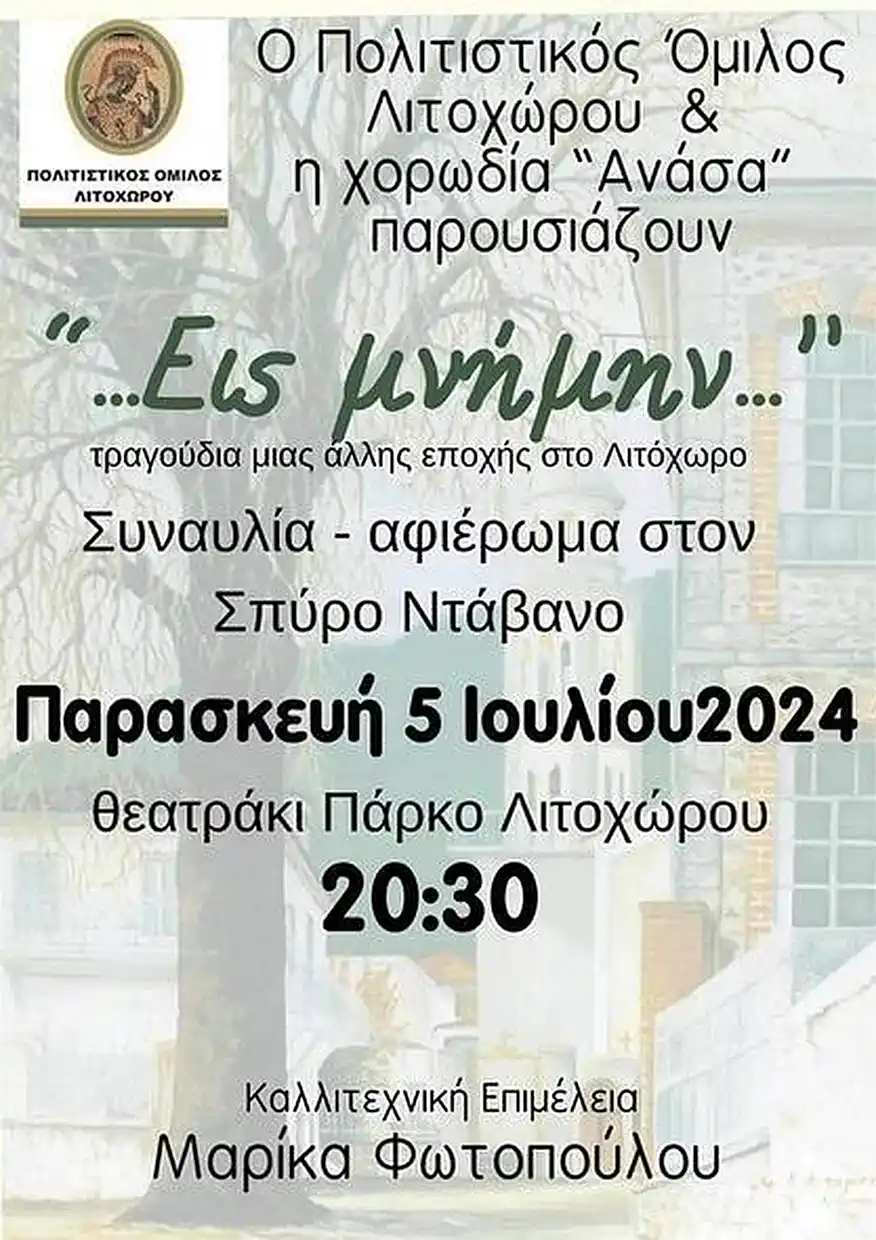 Η εκδήλωση είναι αφιερωμένη στην μνήμη του αείμνηστου Σπύρου Νταβανου δημάρχου Λιτοχώρου, ο οποίος συγκέντρωσε και κατέγραψε την μουσική παράδοση του Λιτοχώρου.